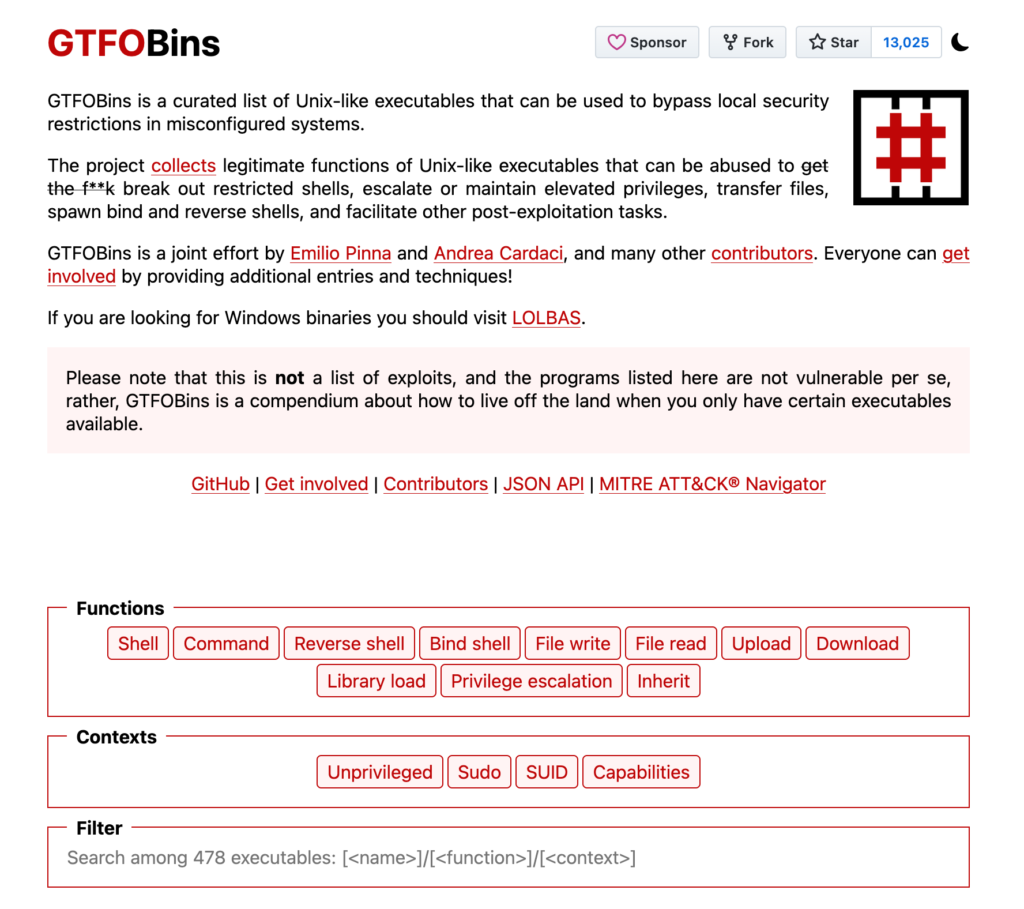 Les 478 binaires sont rangés selon 11 fonctions et 4 contextes d’exécution. Côté fonctions, vous avez : Shell (228 binaires permettent de spawner un shell, oui presque la moitié du catalogue), File-read (199), File-write (84), Inherit (71), Upload (34), Download (32), Command (30), Reverse-shell (21), Privilege-escalation (14), Library-load (11), et Bind-shell (7). Côté contextes : Unprivileged, Sudo, SUID, et Capabilities.