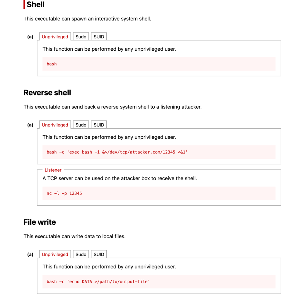 Par exemple, si votre cible a un sudo find sans mot de passe, le site vous donne sur un plateau d’argent sudo find . -exec /bin/sh ; -quit.