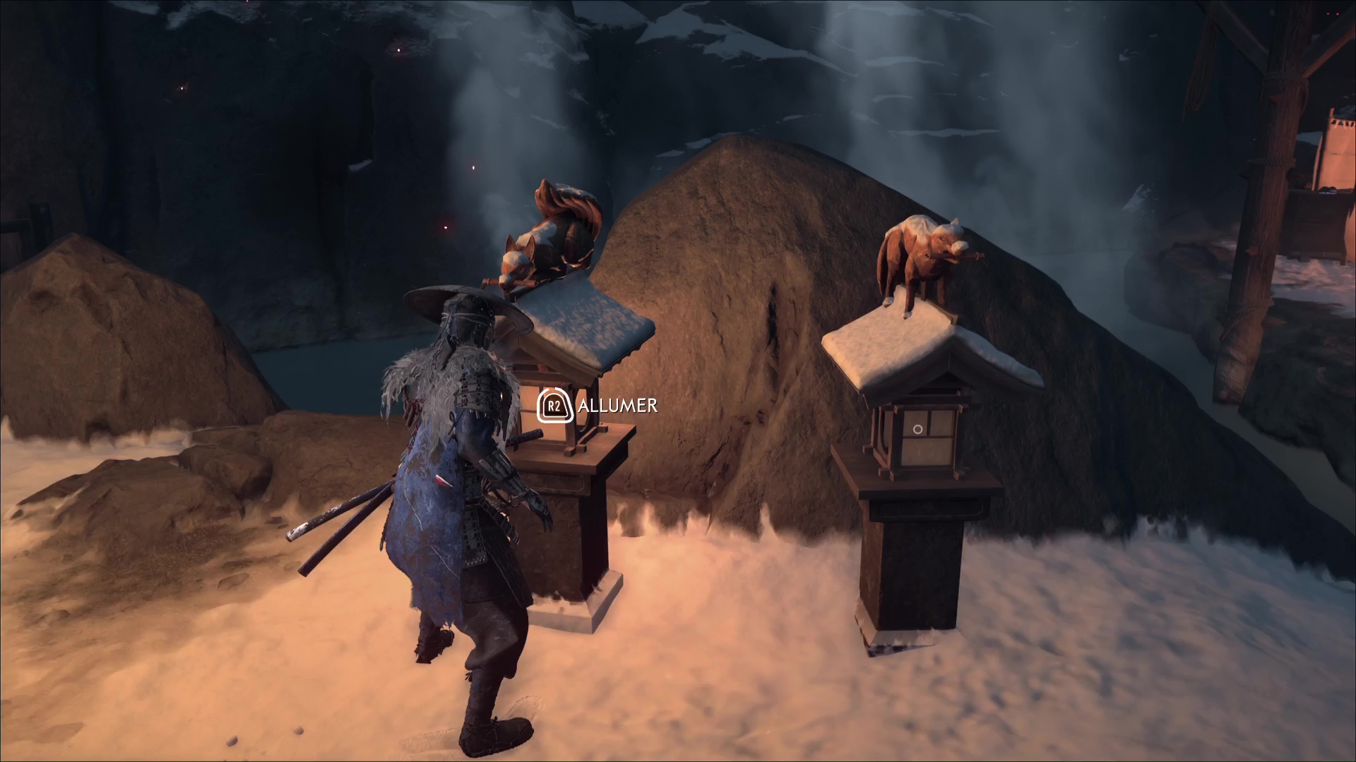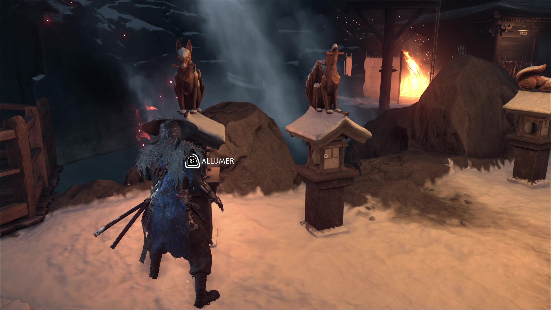 Une fois que le repère est vidé, il reste une petite énigme à réussir pour arriver au bout du repaire. Au fond de la zone, il y a des lanternes de renard à allumer. Prenez une torche dans le braséro et remarquez les deux statues qu’il faut éclairer.