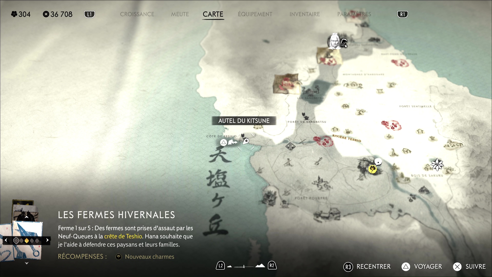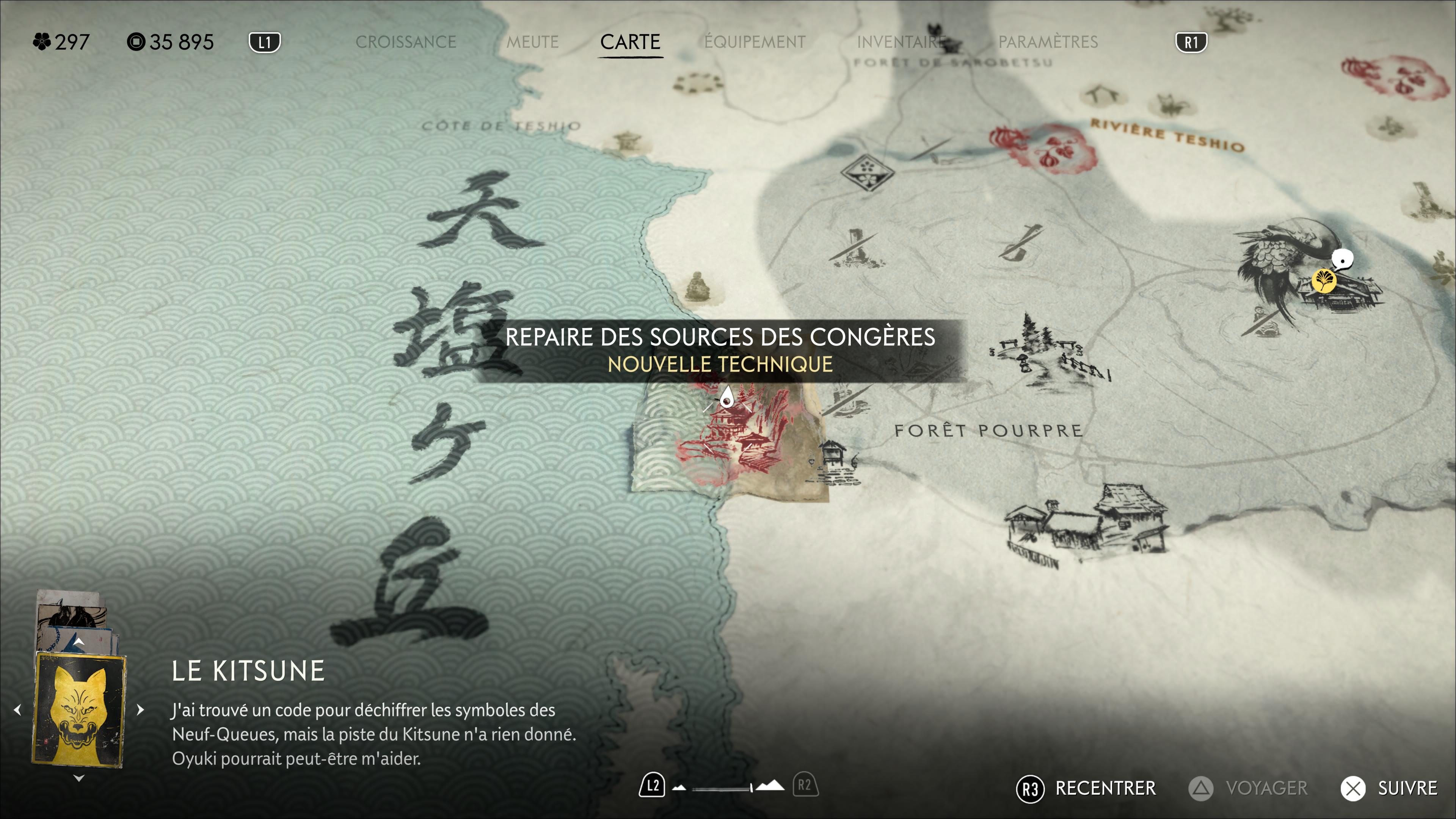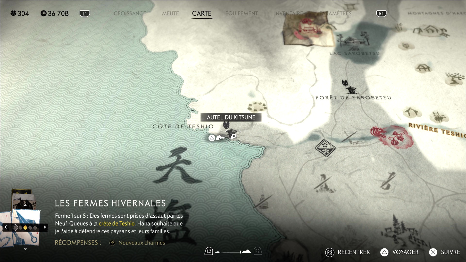 Bien que l’on retrouve les collectibles de Ghost of Yōtei dans chacune des régions, les boîtes casse-têtes sont exclusives à la région de la Crête de Teshio. On les trouve dans 90% des cas soit au pied d’un autel de réflexion d’une zone occupée ou d’un repaire des Neufs-Queue, soit sur un Autel du Kitsune.