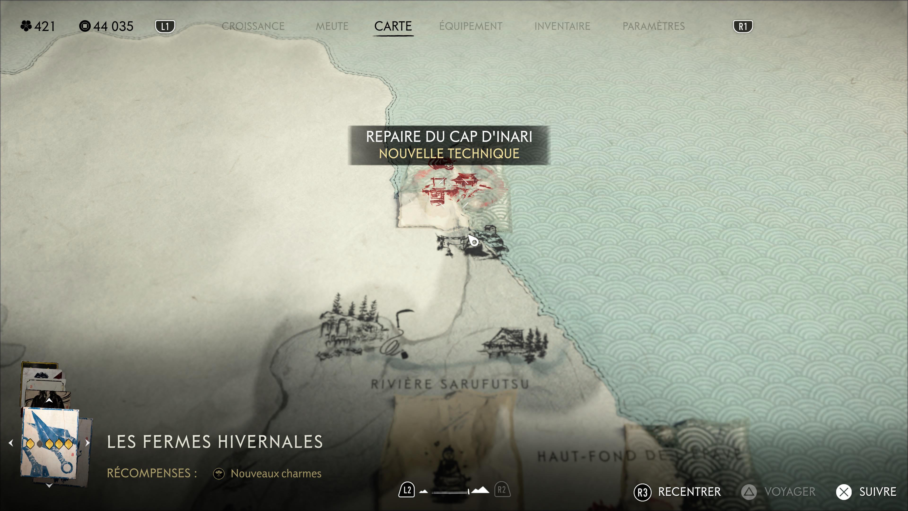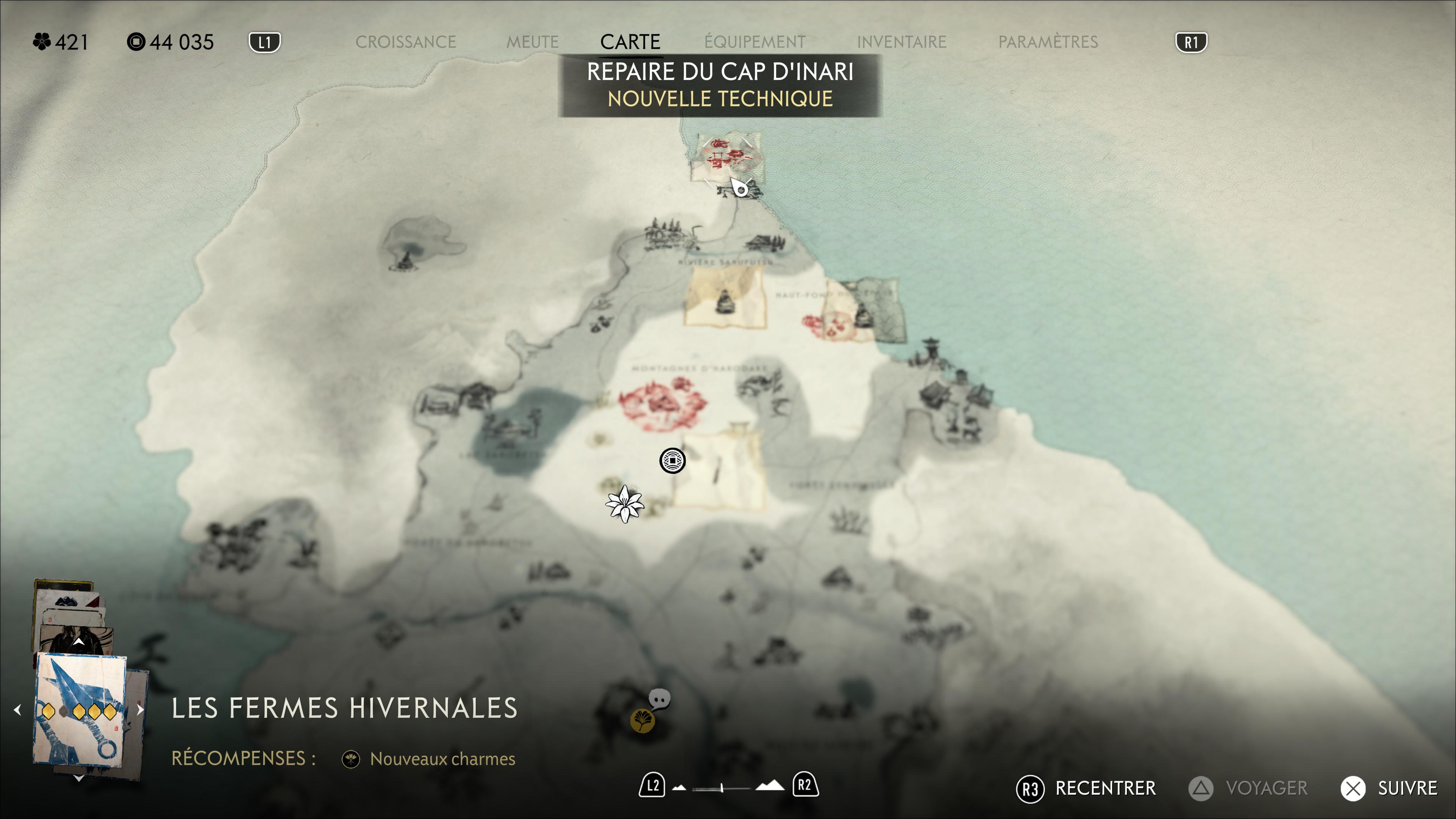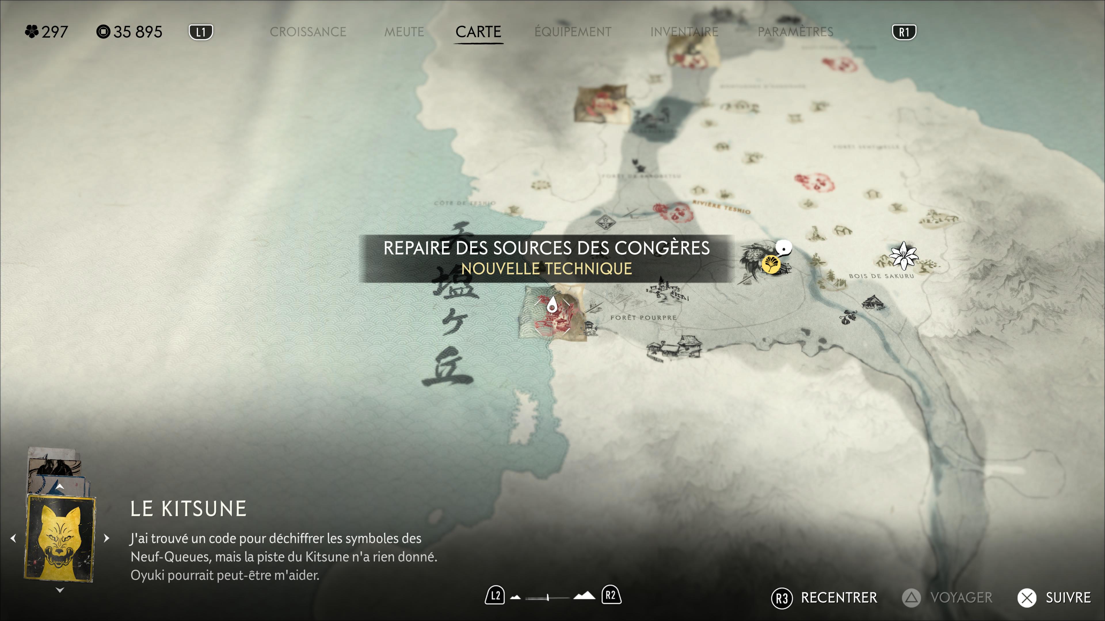 Bien que l’on retrouve les collectibles de Ghost of Yōtei dans chacune des régions, les boîtes casse-têtes sont exclusives à la région de la Crête de Teshio. On les trouve dans 90% des cas soit au pied d’un autel de réflexion d’une zone occupée ou d’un repaire des Neufs-Queue, soit sur un Autel du Kitsune.