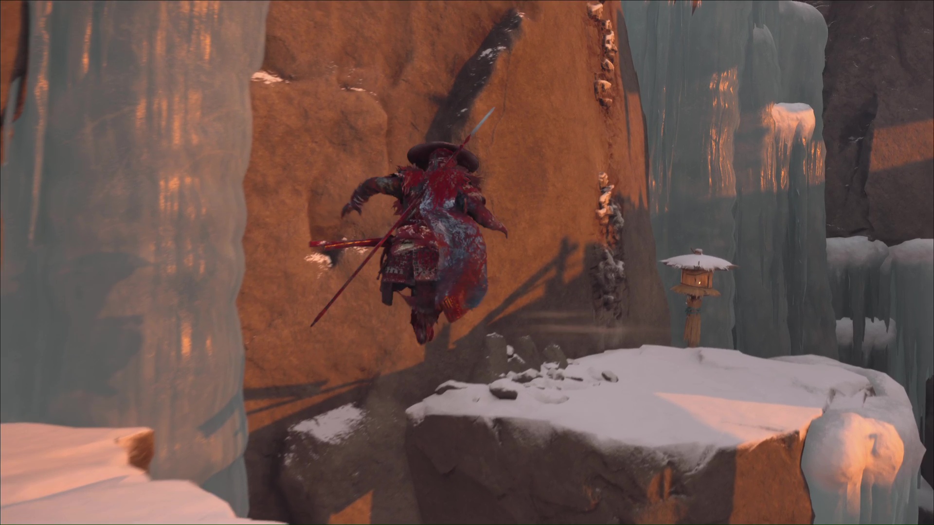 Réchauffez-vous un peu plus loin si besoin mais, dans tous les cas, enchaînez les sauts des plateformes en bois puis sautez et rattrapez-vous aux prises en face. Escaladez pour enfin arriver au niveau de l’autel de réflexion.
