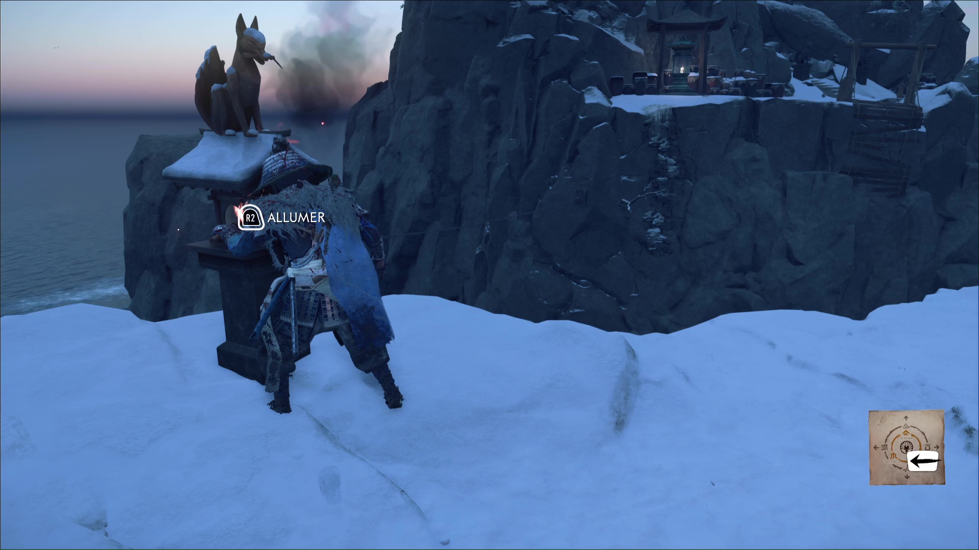 Rendez-vous à la Côte de Teshio, une zone isolée à l’ouest de la région, là où se trouve l’entrée du Repaire du fléau des neiges. Tout près de ce repaire, et au bord de la côte, vous tomberez sur un Autel du Kitsune. La boîte singulière repose dessus.