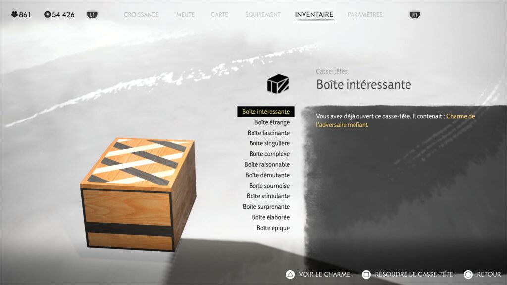 Pour les résoudre, il faut déplacer des taquets noirs et certaines faces de la boîte de sorte que le couvercle du haut soit déverrouillé. Parfois, quelques mouvements suffisent, et d’autres fois la solution demande un peu plus de manipulations. À l’intérieur, vous y trouverez quelques récompenses fixes, comme des charmes ou un masque. Mais la plupart du temps, il peut s’agir d’une ressource, d’argent, de pièces ou carrément de fragments de carte du voyageur, selon l’avancée de votre exploration.