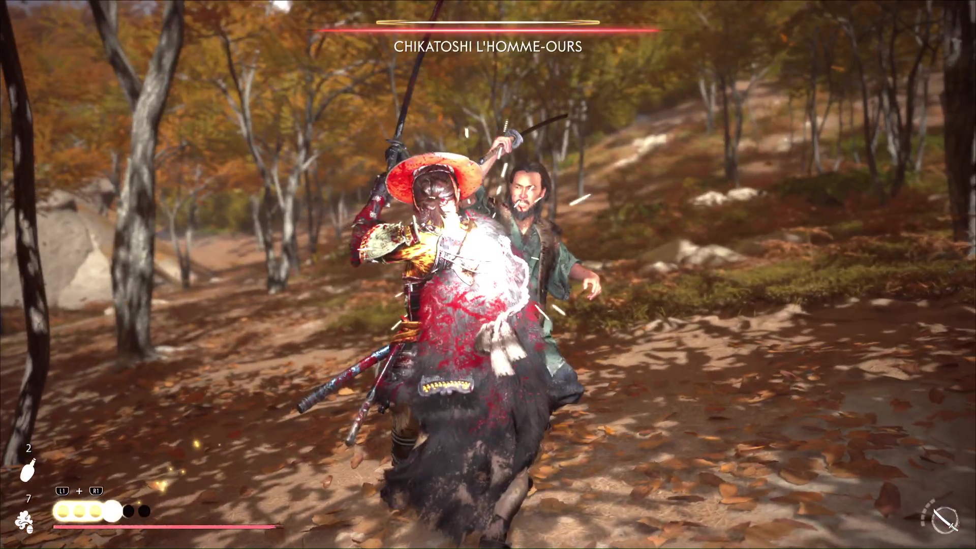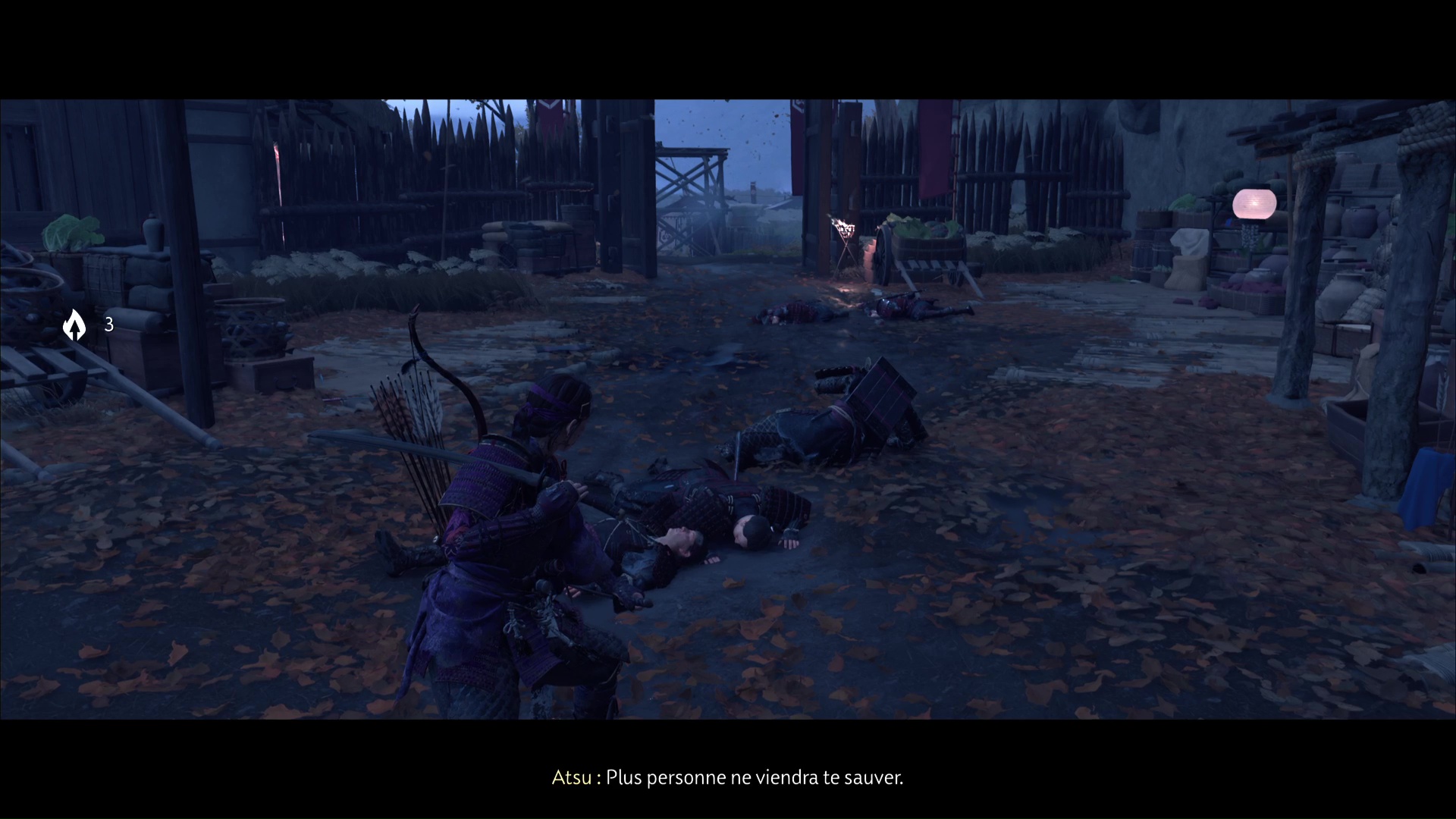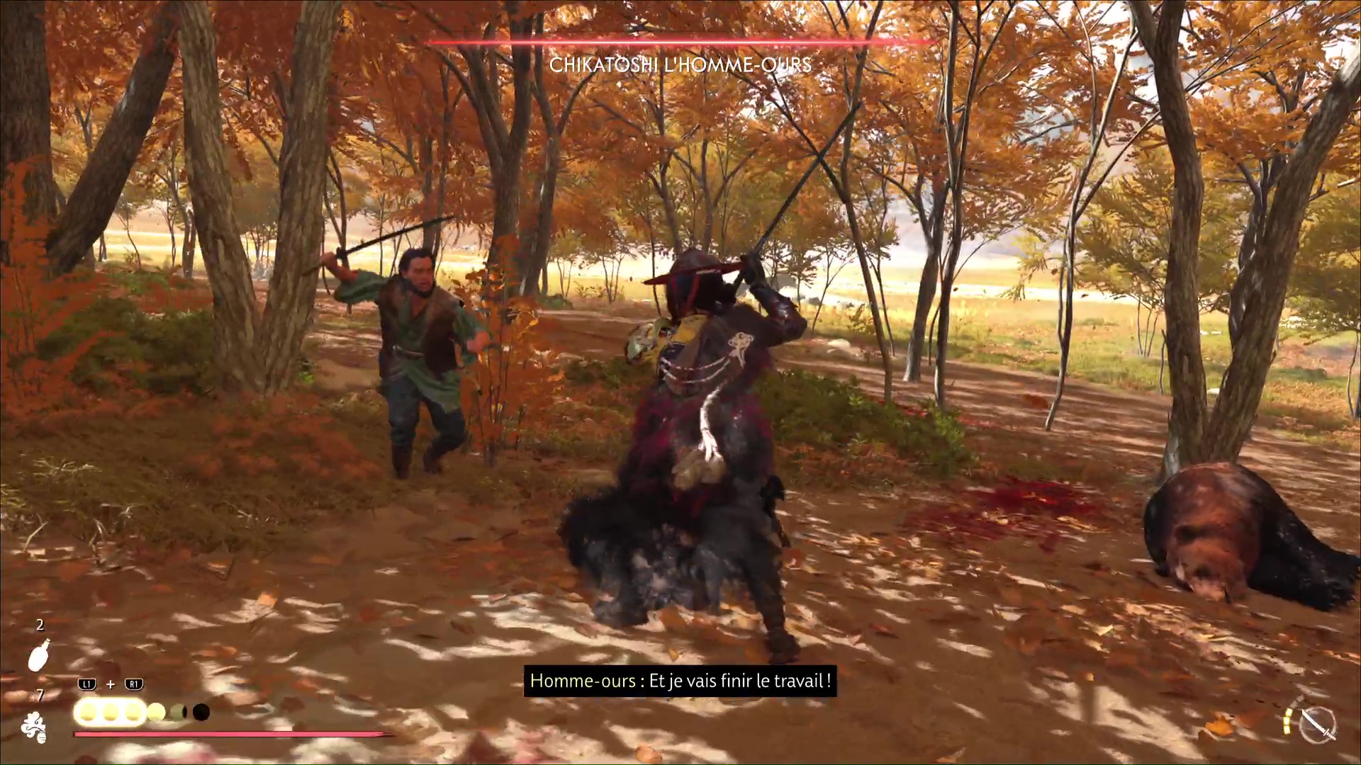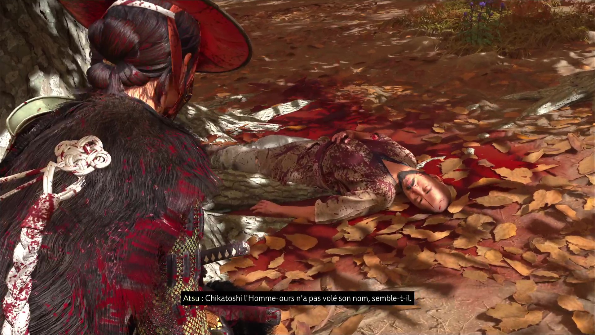 Cela fera venir Chikatoshi qui désirera se venger. Le bougre n’a pas vraiment d’attaques particulièrement notables. Vous n’aurez donc que peu de difficultés à le vaincre. Et une fois mort, vous récupérez sur son cadavre le kit de sabre Festin bestial. N’oubliez pas sa prime de 750 pièces à encaisser auprès de Kojiro.