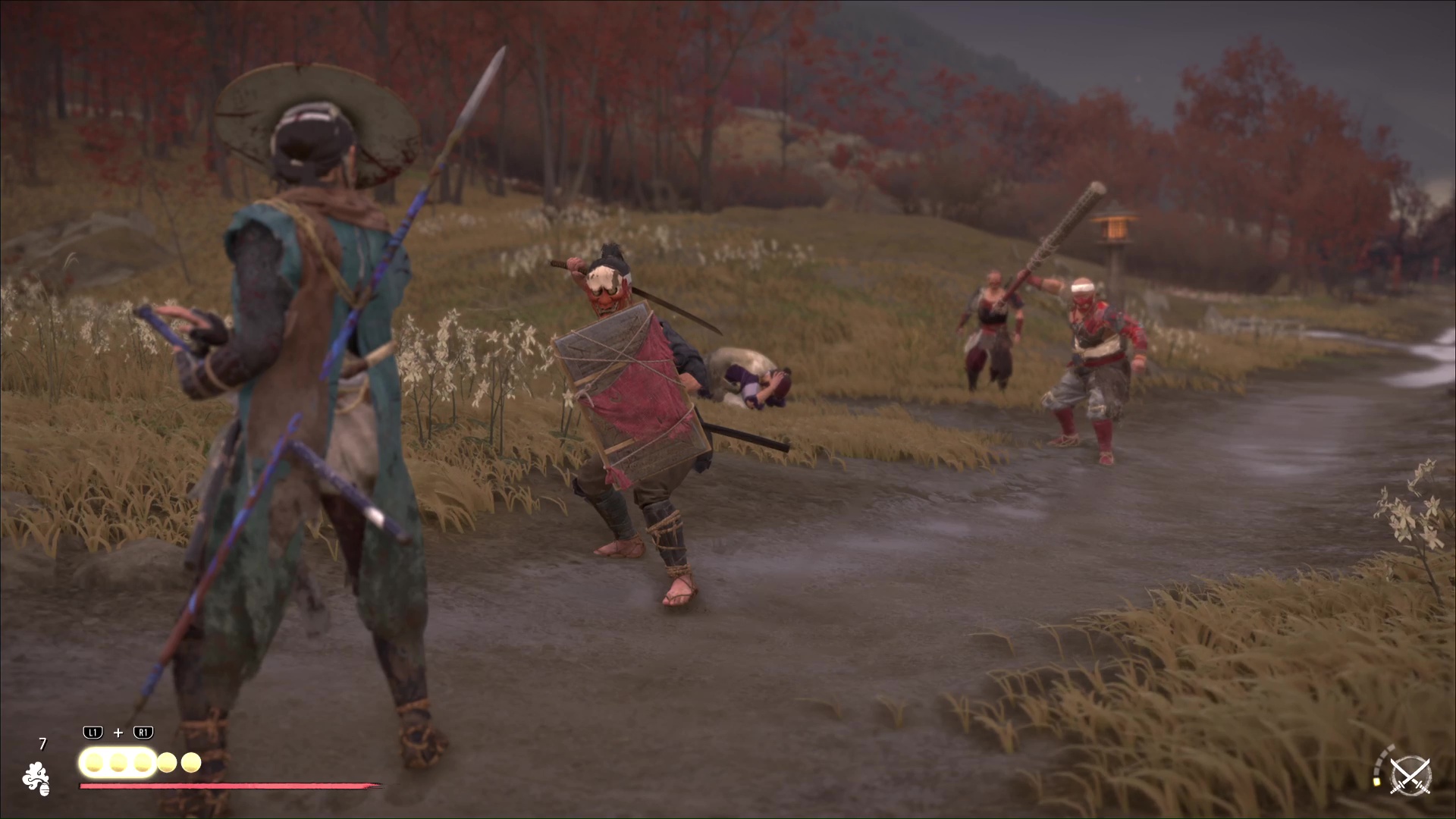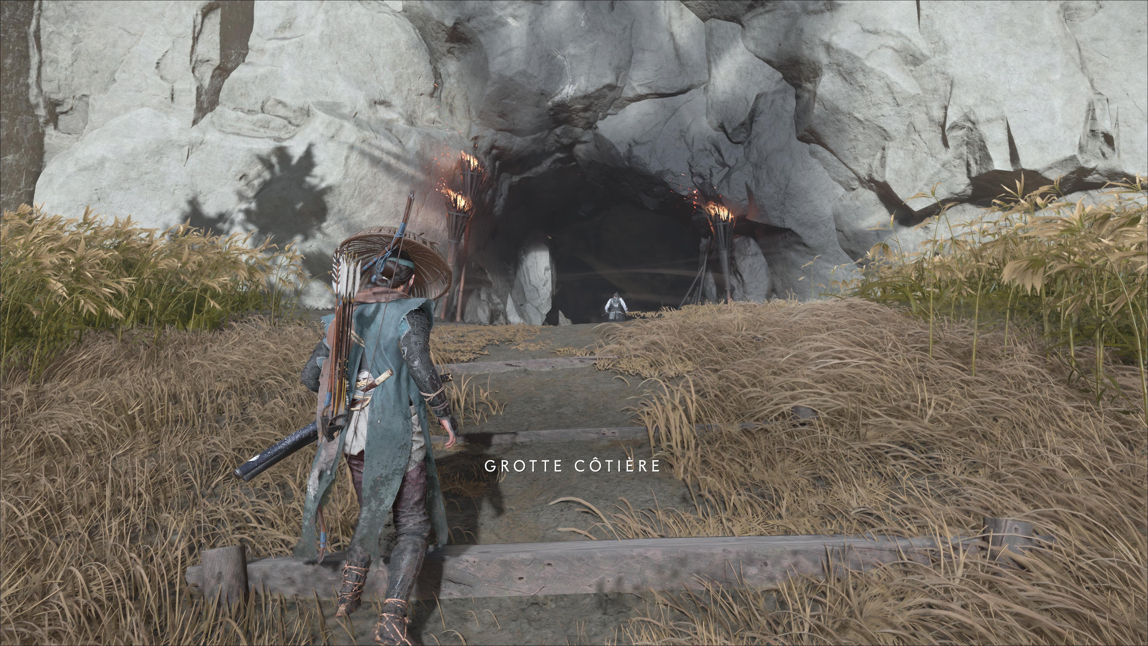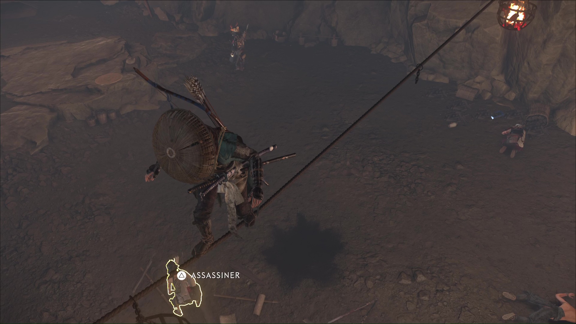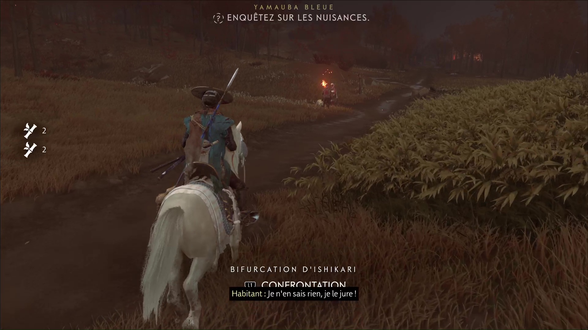 Vous ne tarderez pas à arriver dans la zone où se trouve Toshi la Torche et ses hommes, en plein meurtre. Montez sur la gauche pour surplomber la zone. Comme les Trois Brigands des Prairies de Yōtei, Toshi la Torche fait partie des primes que l’on peut tuer d’un seul coup en étant discret.