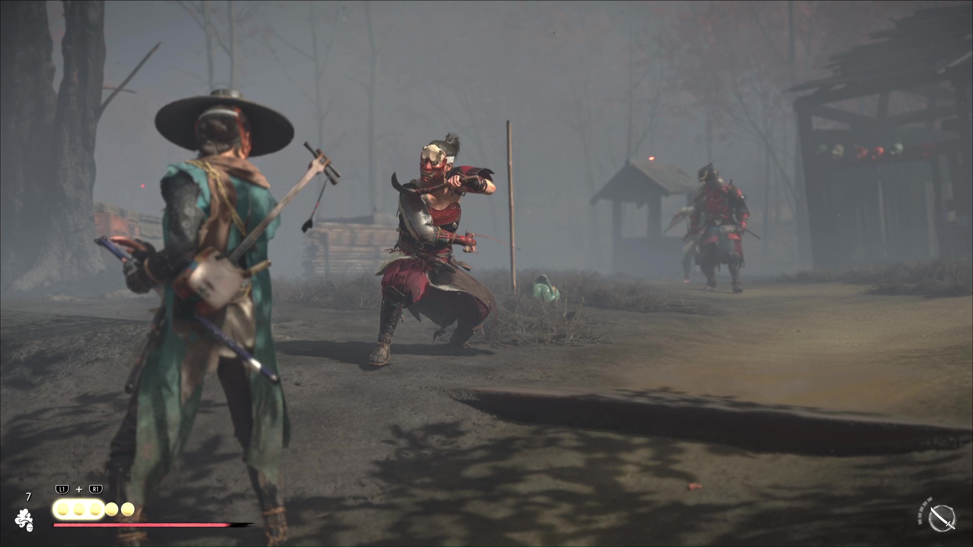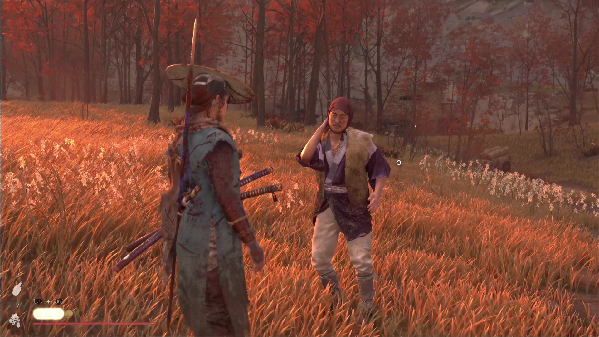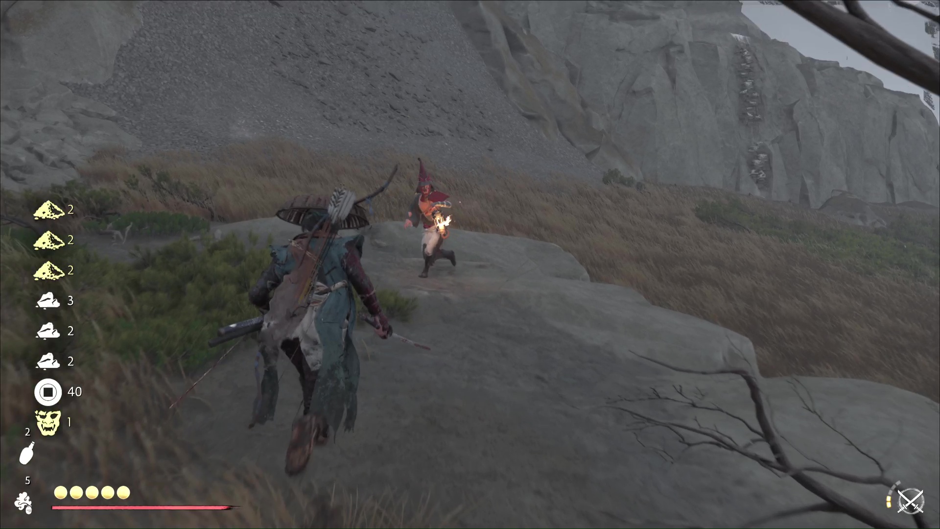 Vous ne tarderez pas à arriver dans la zone où se trouve Toshi la Torche et ses hommes, en plein meurtre. Montez sur la gauche pour surplomber la zone. Comme les Trois Brigands des Prairies de Yōtei, Toshi la Torche fait partie des primes que l’on peut tuer d’un seul coup en étant discret.