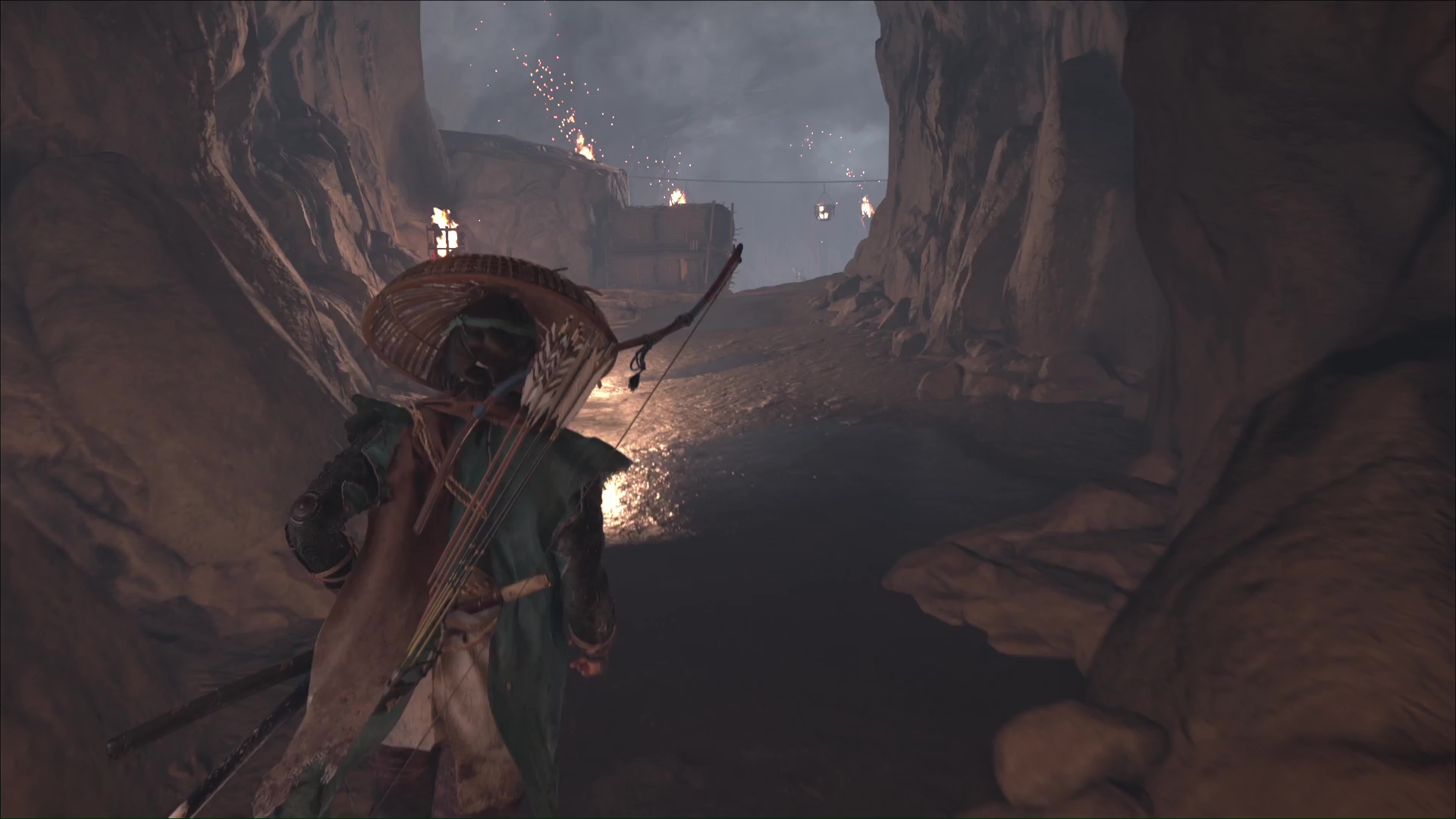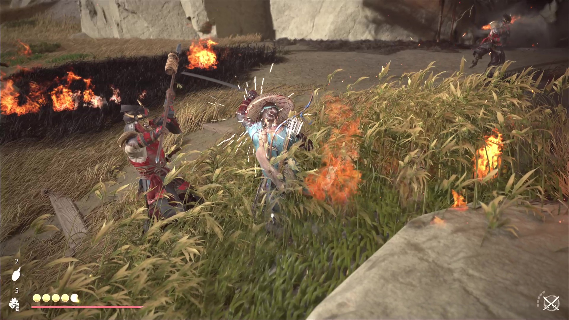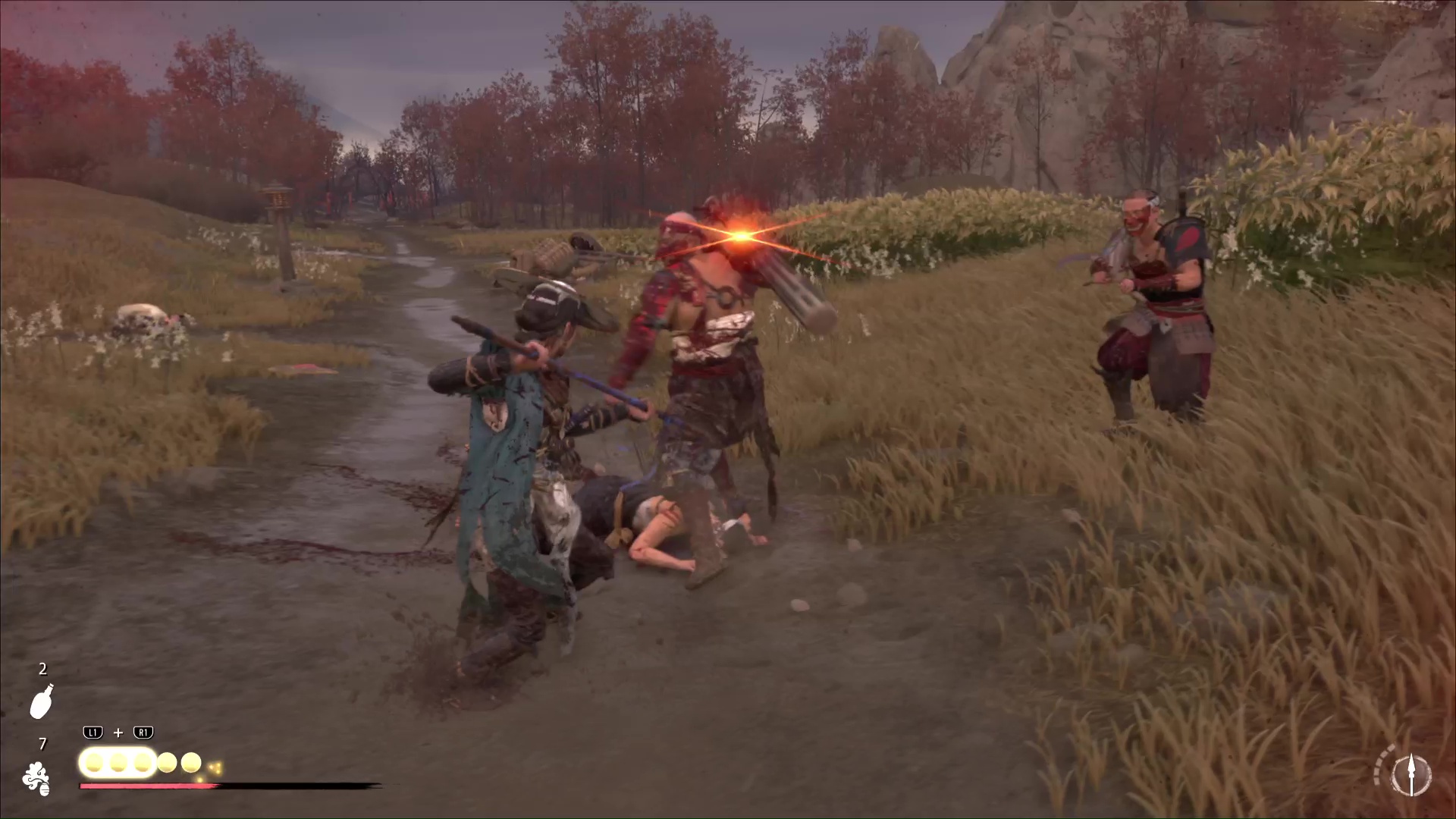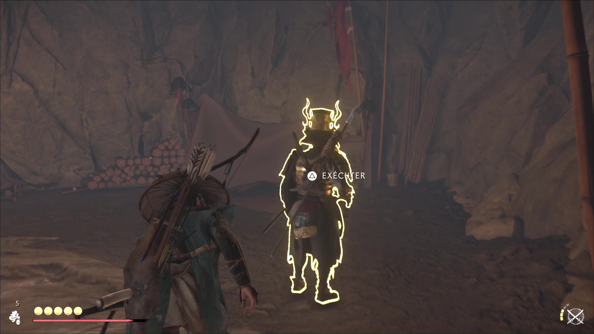 Vous ne tarderez pas à arriver dans la zone où se trouve Toshi la Torche et ses hommes, en plein meurtre. Montez sur la gauche pour surplomber la zone. Comme les Trois Brigands des Prairies de Yōtei, Toshi la Torche fait partie des primes que l’on peut tuer d’un seul coup en étant discret.