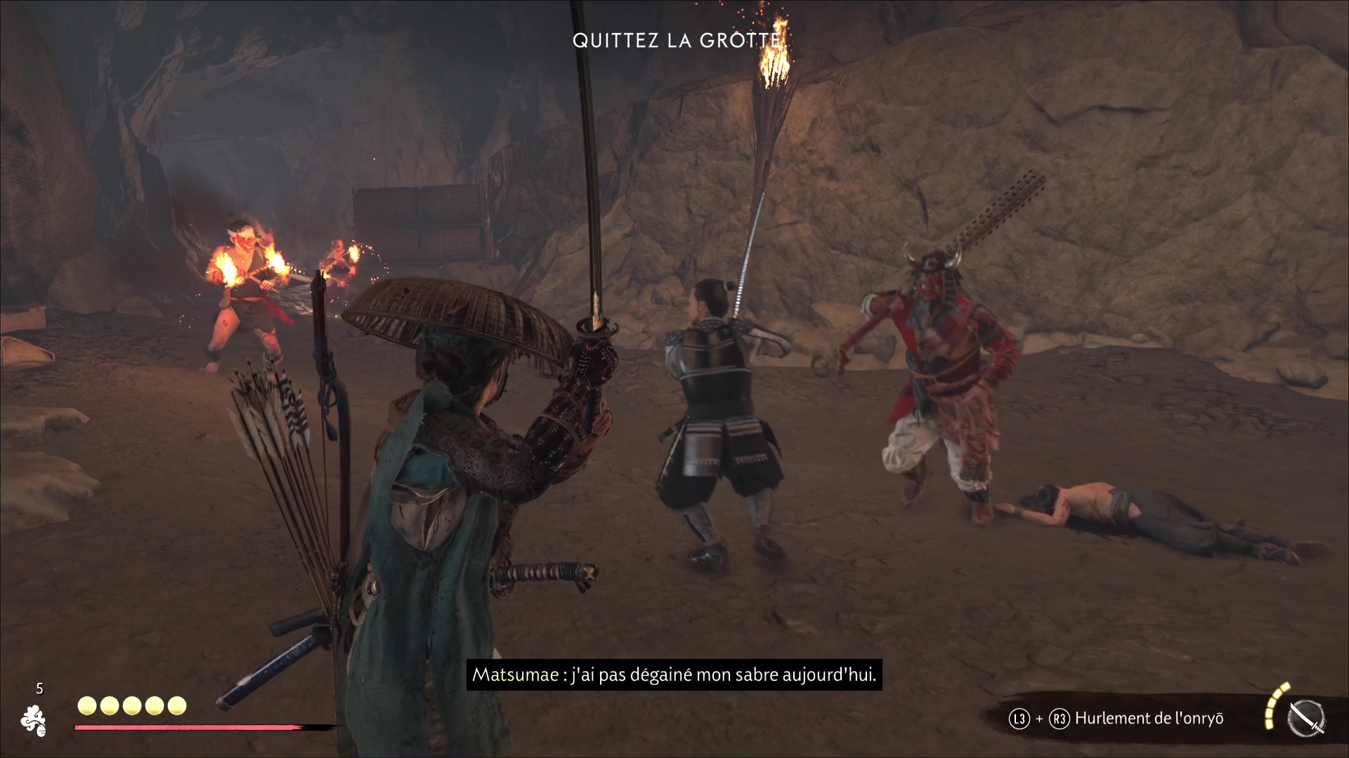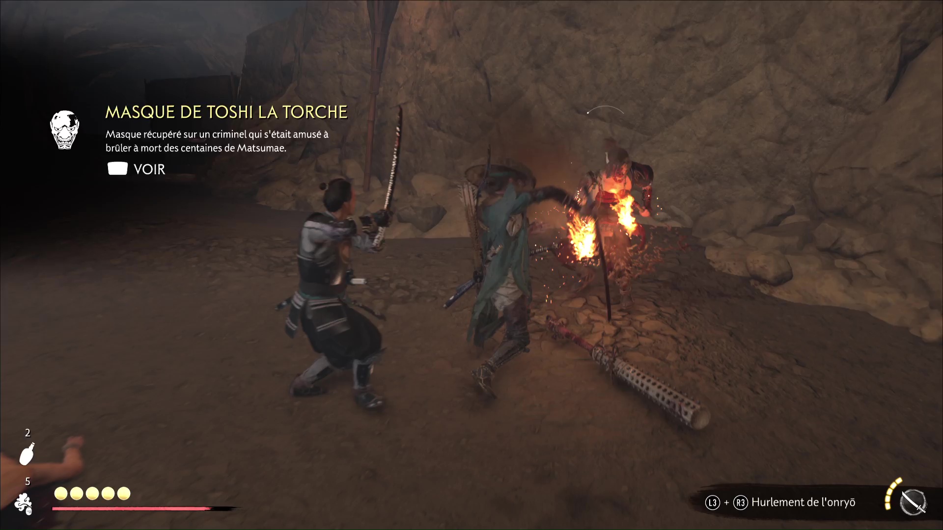Attention à la brute et aux faucilles enflammées des deux autres. Une fois le ménage fait et avant de quitter la grotte, n’oubliez pas de ramasser le Masque de Toshi la Torche sur son cadavre.
