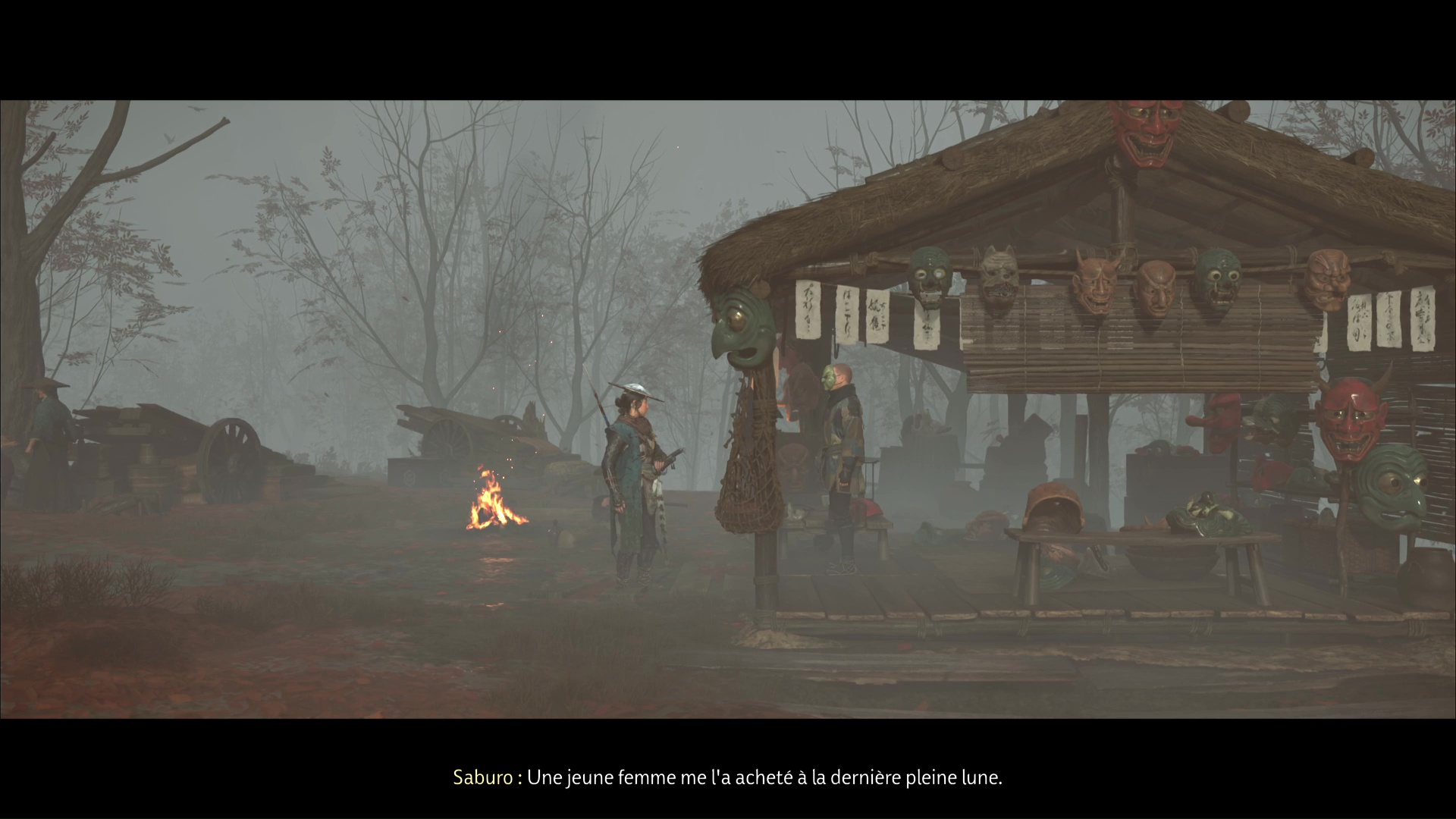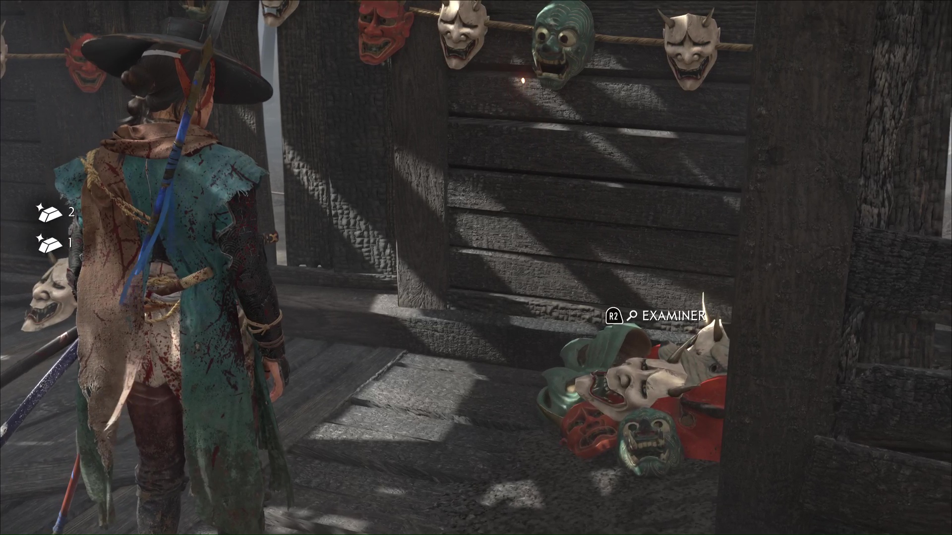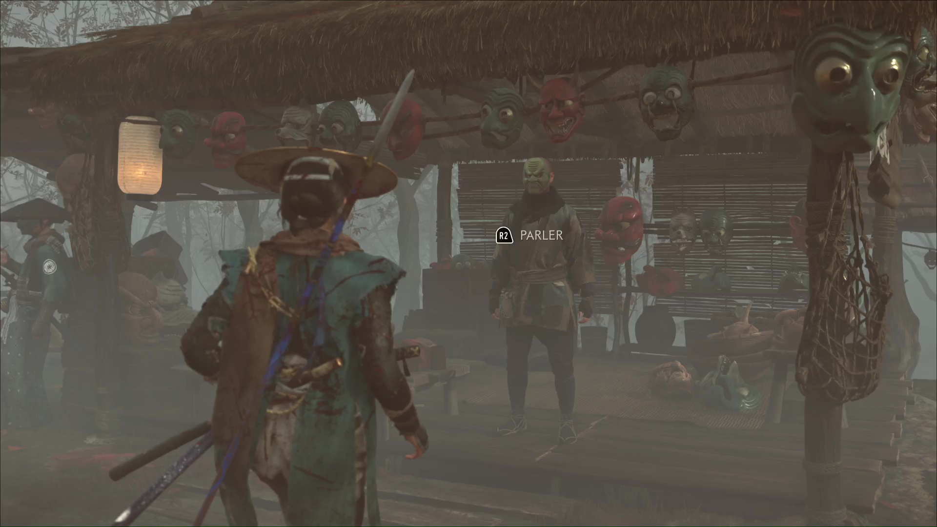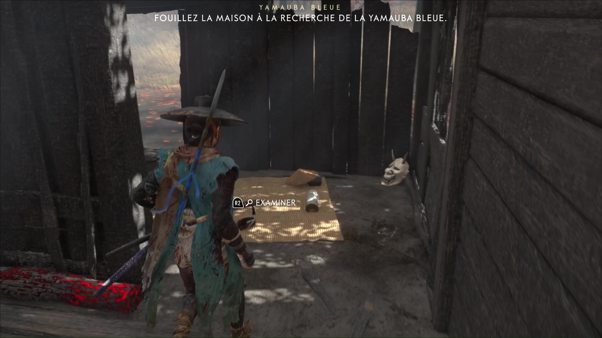 Examinez le tas de masques de pillards d’Oni dans un coin de la pièce, ainsi que la poupée brûlée posée sur un lit. Soudain, Miyo, la femme dont vous a parlé Saburo, arrive pour vous tuer.