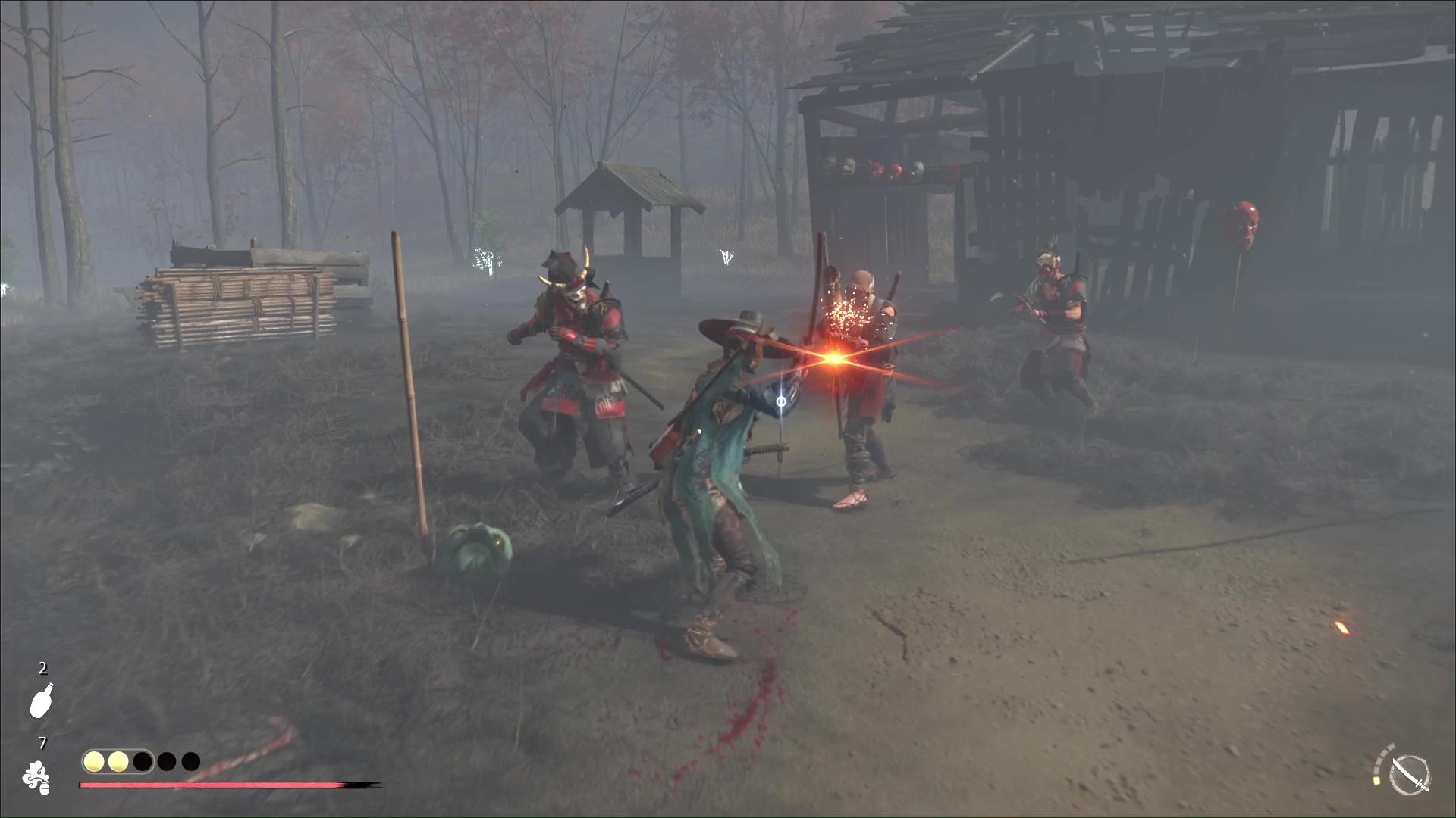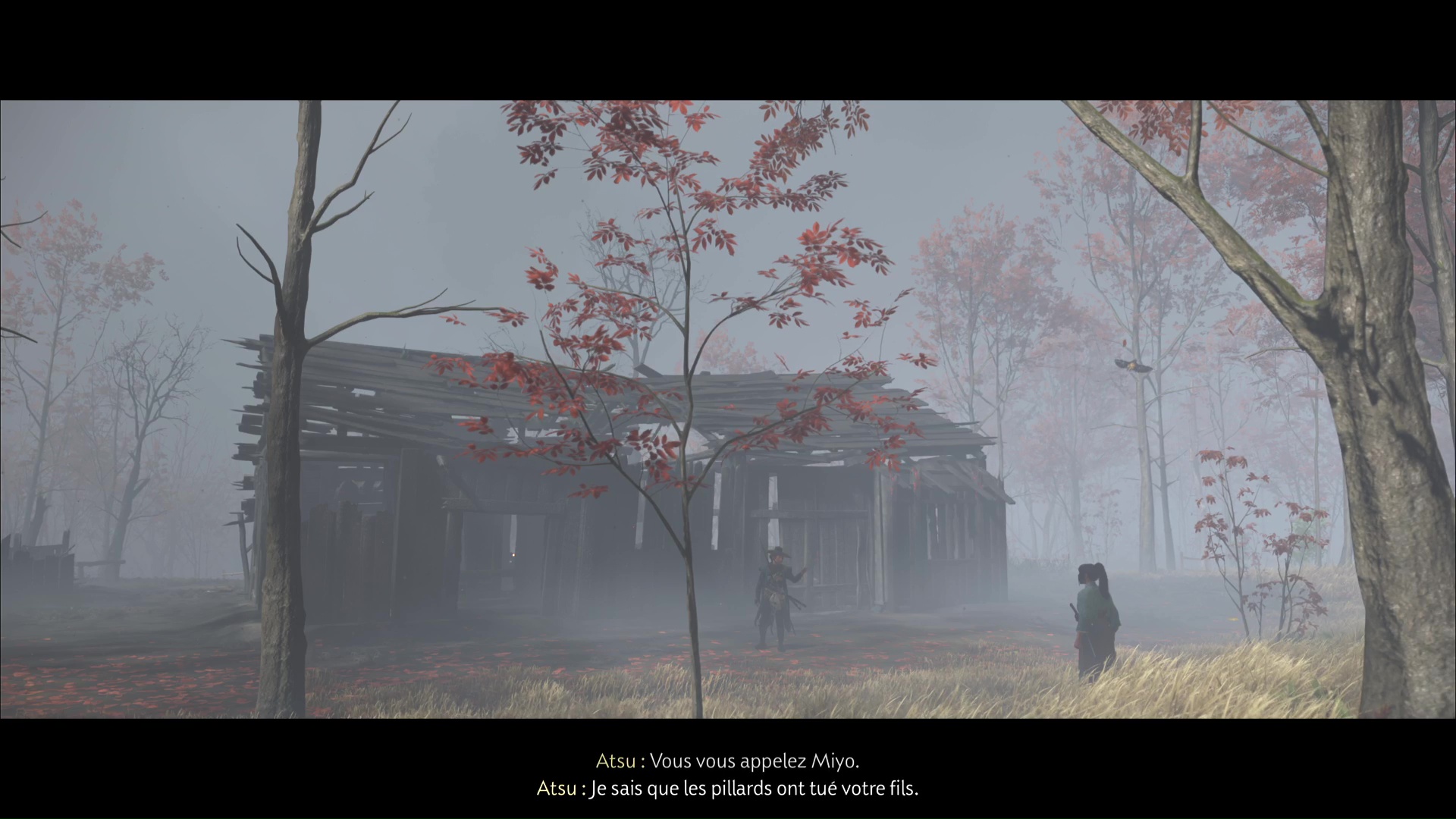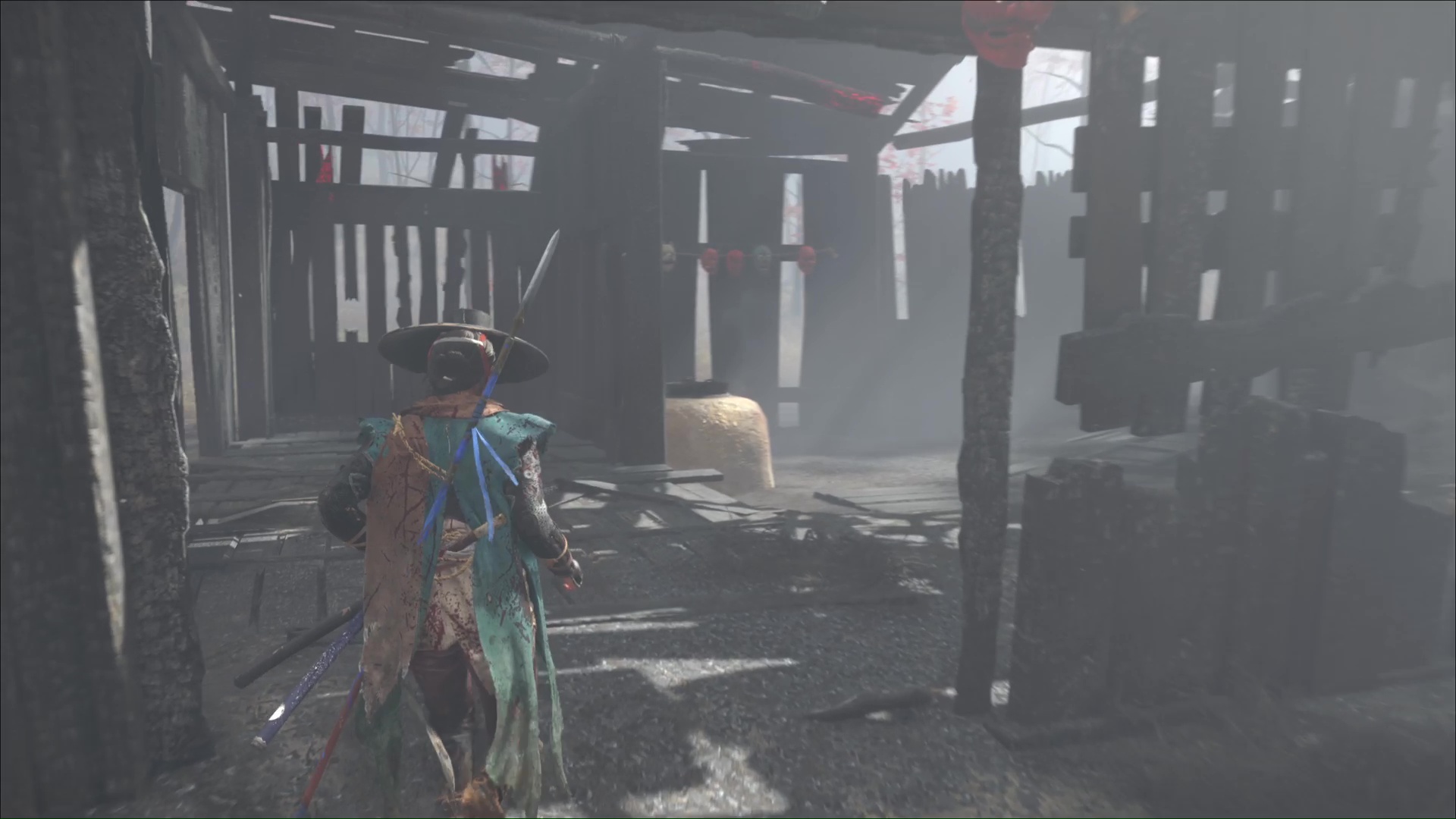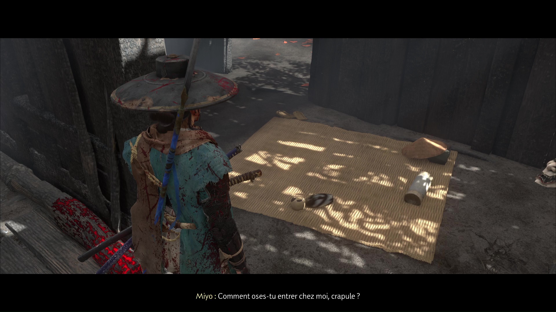 Examinez le tas de masques de pillards d’Oni dans un coin de la pièce, ainsi que la poupée brûlée posée sur un lit. Soudain, Miyo, la femme dont vous a parlé Saburo, arrive pour vous tuer.