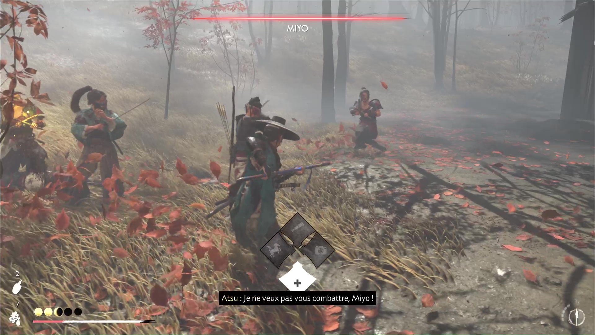 Consciente de l’histoire malheureuse derrière la vie de Miyo, Atsu essaye d’éviter le combat. Malheureusement d’autres pillards débarquent et Miyo perd confiance en vous, ce qui lance un combat.
