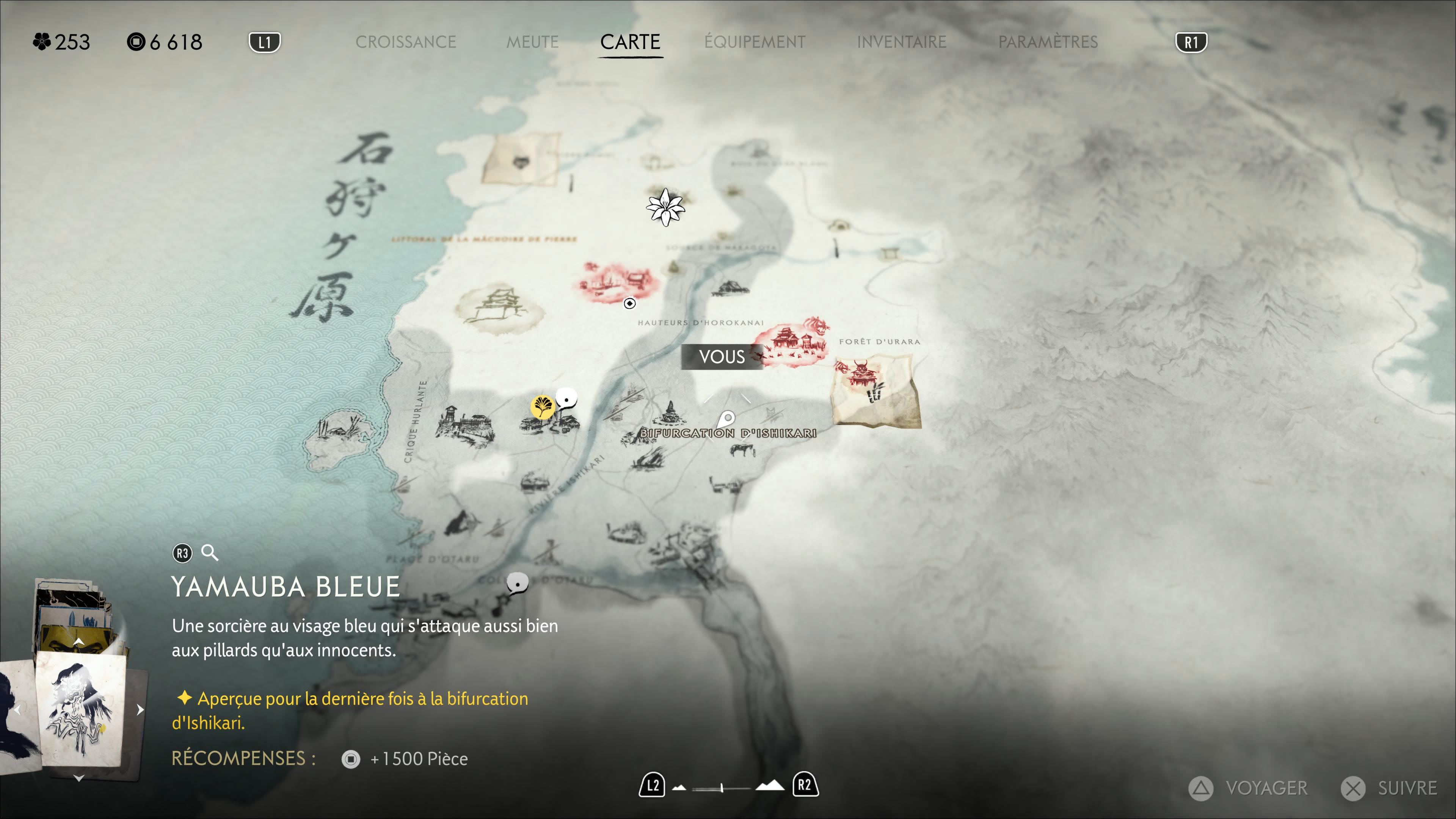 Un homme à la tête de tortue, la proie d’un samouraï Matsumae, ou bien une terrifiante Yamauba bleue, voici quelques-unes des cibles à chasser dans les Plaines d’Ishikari, une des régions de Ghost of Yōtei. Des masques, kits de sabre et autres récompenses supplémentaires sont parfois à récupérer sur le cadavre de vos proies.