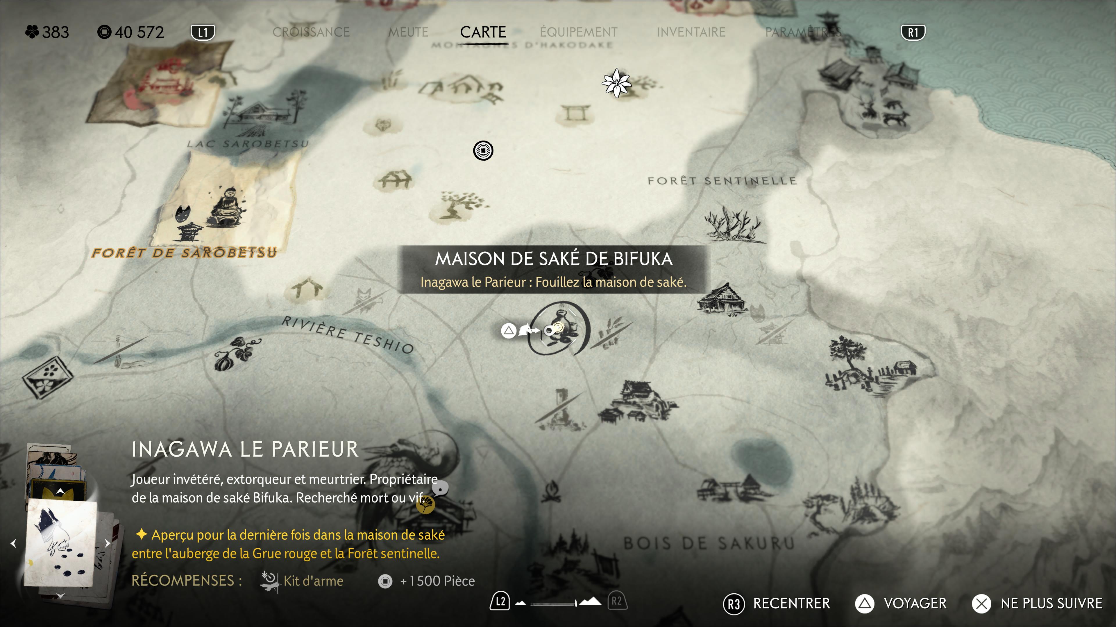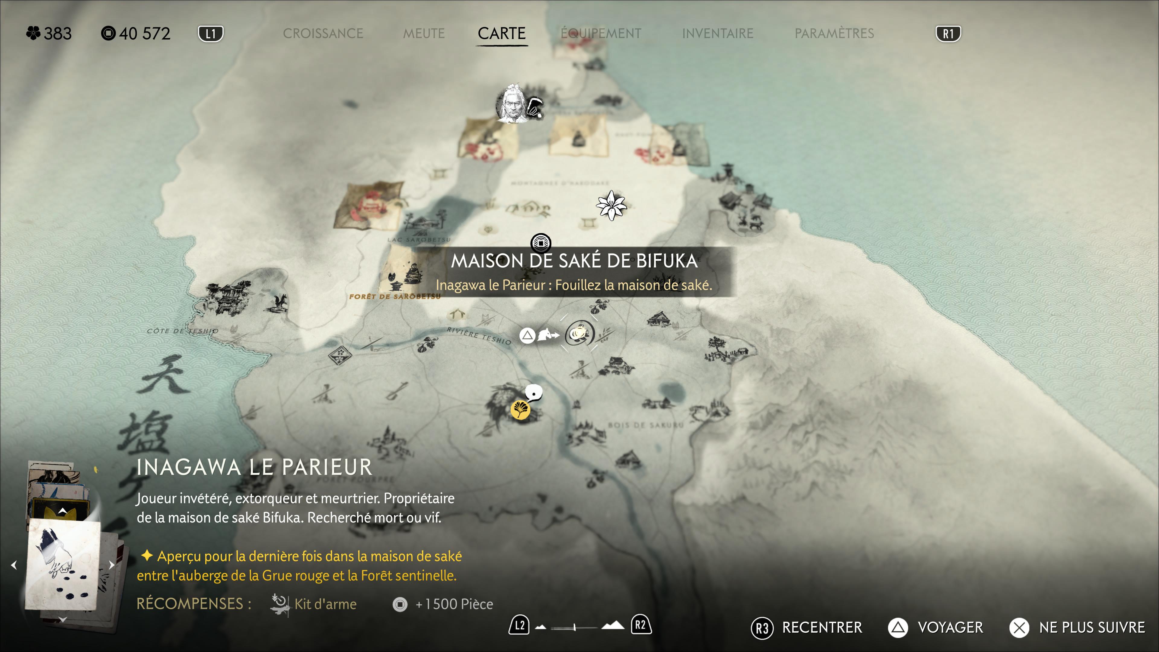 La prime sur la tête de Inagawa le Parieur ne vous sera accessible qu’après avoir réussi d’autres primes. Il faut ensuite s’adresser à Kojiro, lequel vous apprendra que votre cible se terre à la Maison de saké de Bifuka, à l’est de la Rivière Teshio et au nord-est de l’Auberge de la Grue rouge.