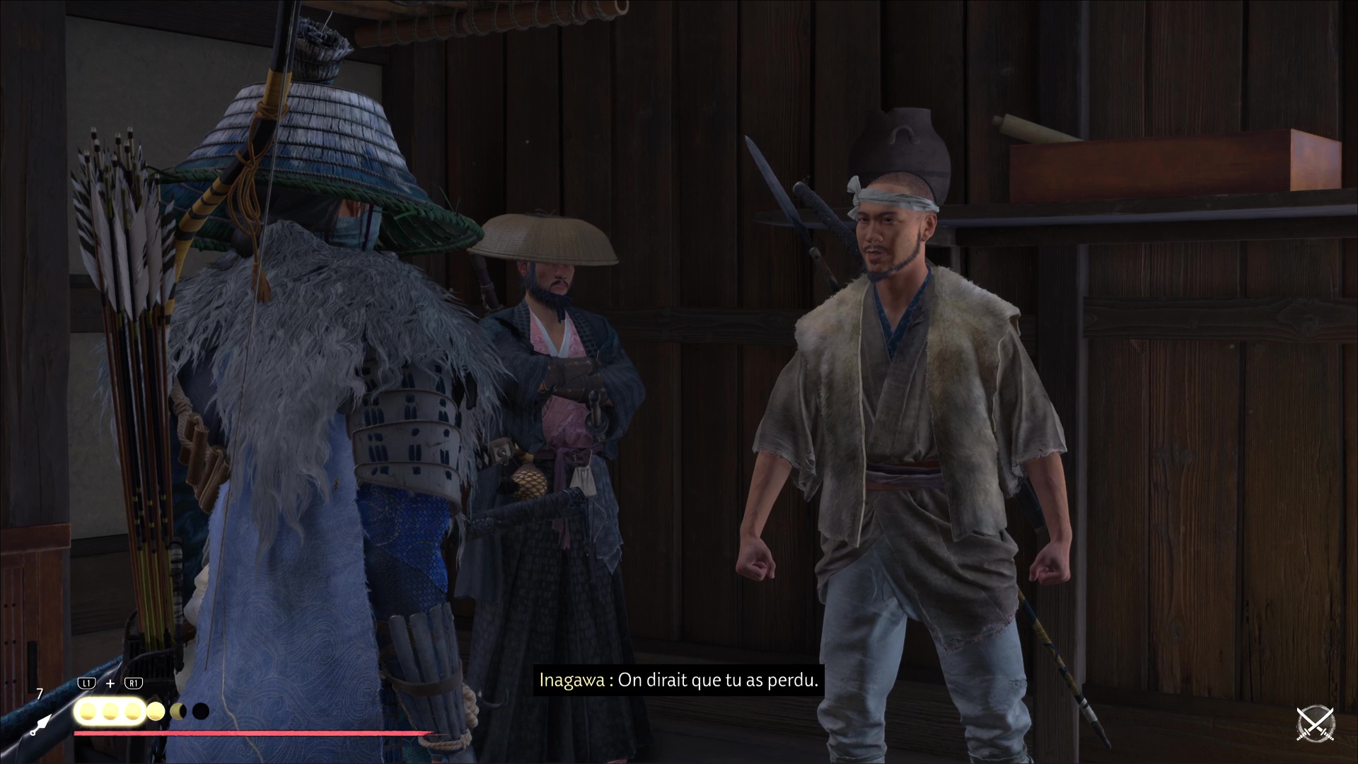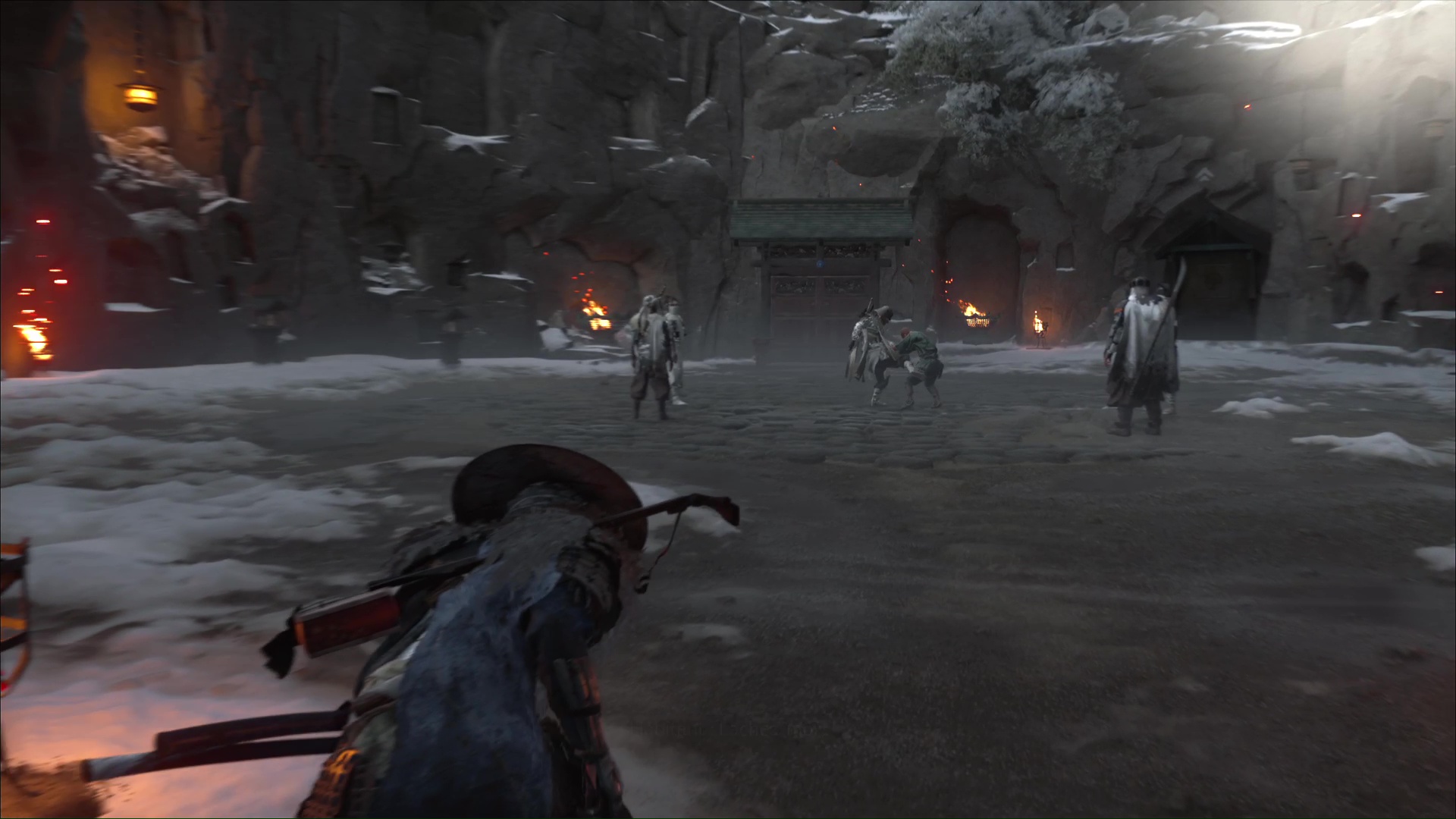 Mais comme vous pouvez vous y attendre, une fois dehors, il rameute ses hommes et un combat se lance. Il y a au moins deux archers, un porteur de kusarigama, et un lancier, parmi les autres qui manient un katana.