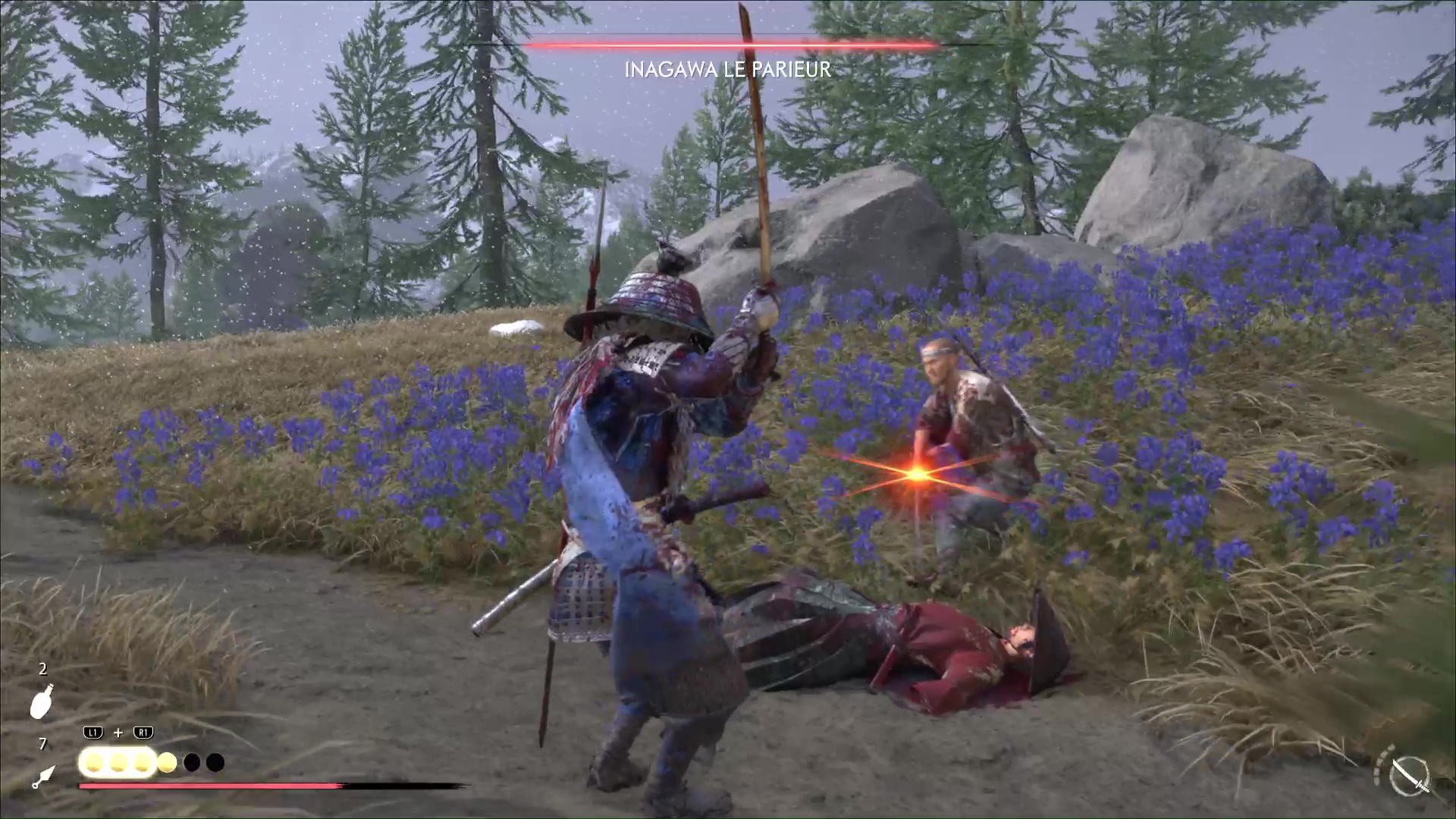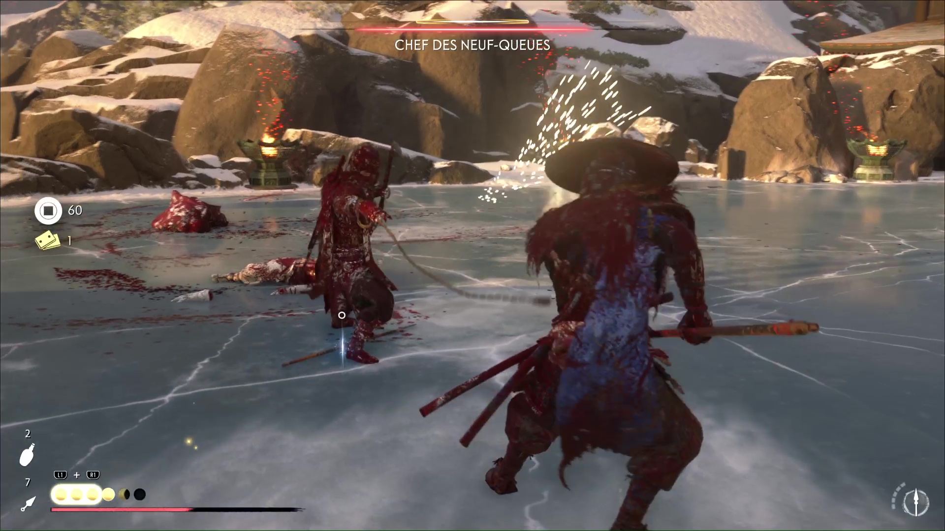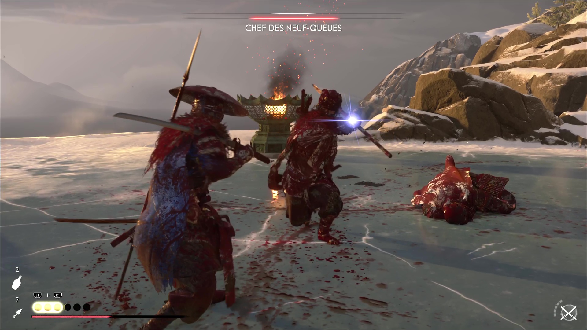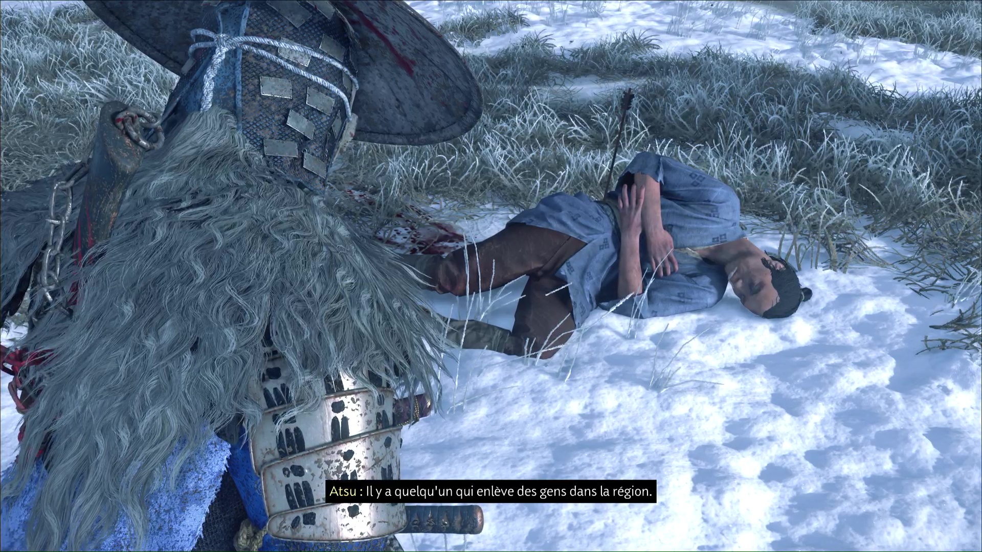 Dans cette configuration, utiliser votre lance est préférable, si vous l’avez. Et si jamais c’est lui qui utilise sa lance, switchez alors sur le double katana. Une fois celui-ci à terre, vous récupérerez son sabre Mort sans nom. Vous n’aurez plus qu’à récupérer la prime de 2 000 pièces, après avoir rejoint l’autel de réflexion et une Boîte complexe un peu plus loin.