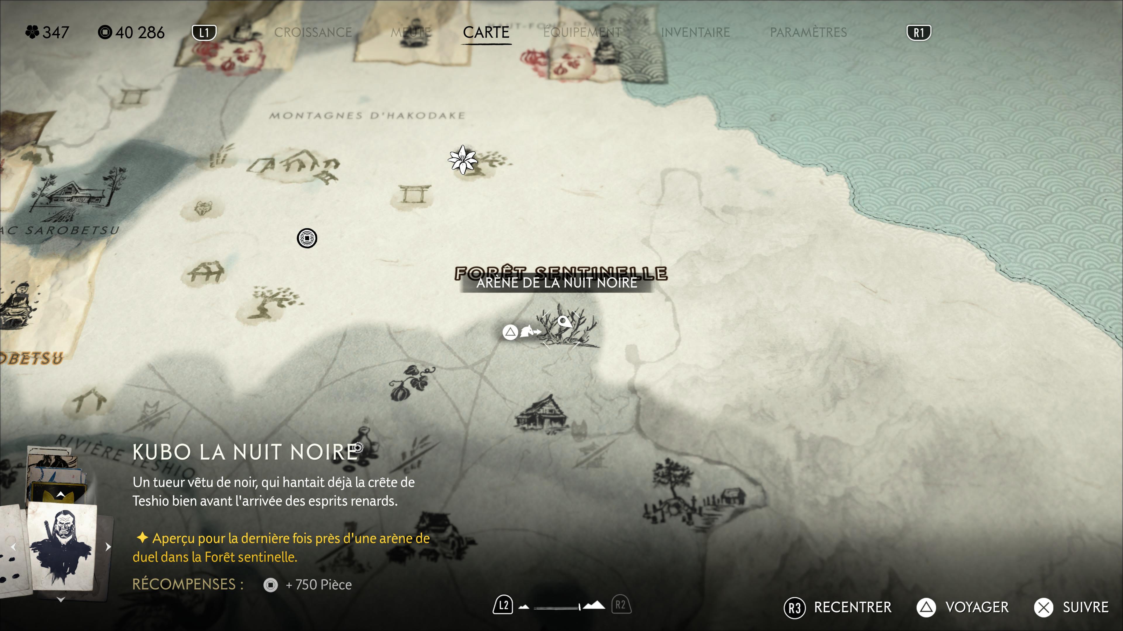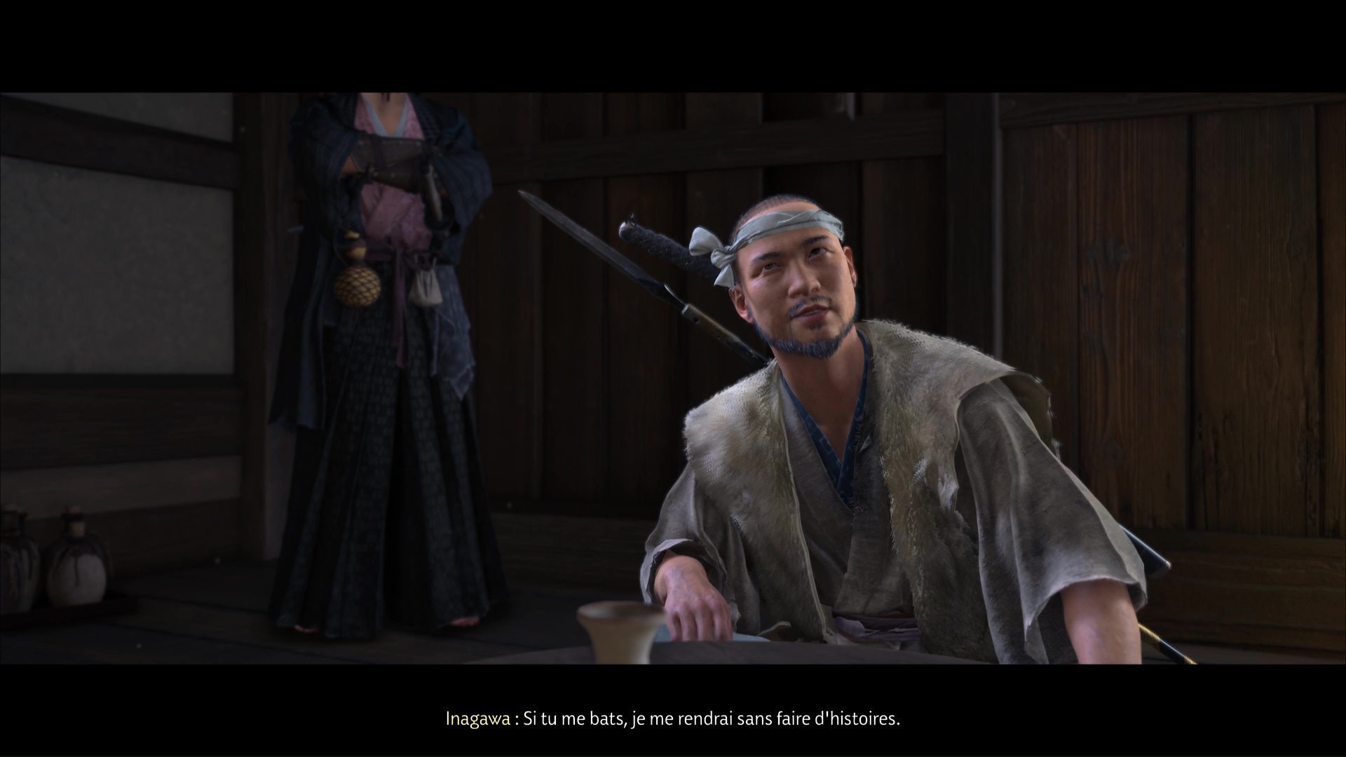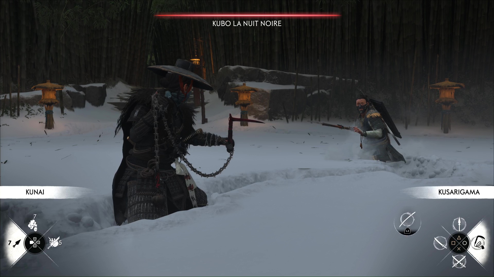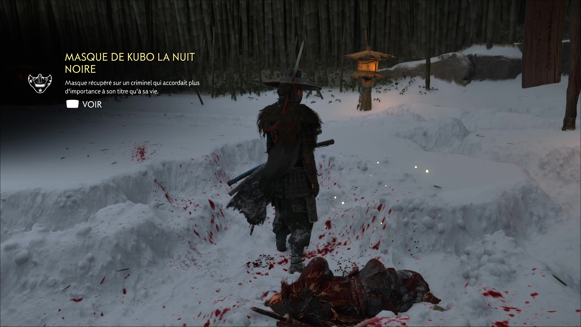 Il dispose aussi d’un bouclier et d’une épée qu’il est susceptible de sortir. En ce cas, switchez sur votre kusarigama si vous le possédez. Kubo désormais à terre, récupérez sur son cadavre le Masque de Kubo la Nuit noire, et allez encaisser votre prime de 750 pièces.