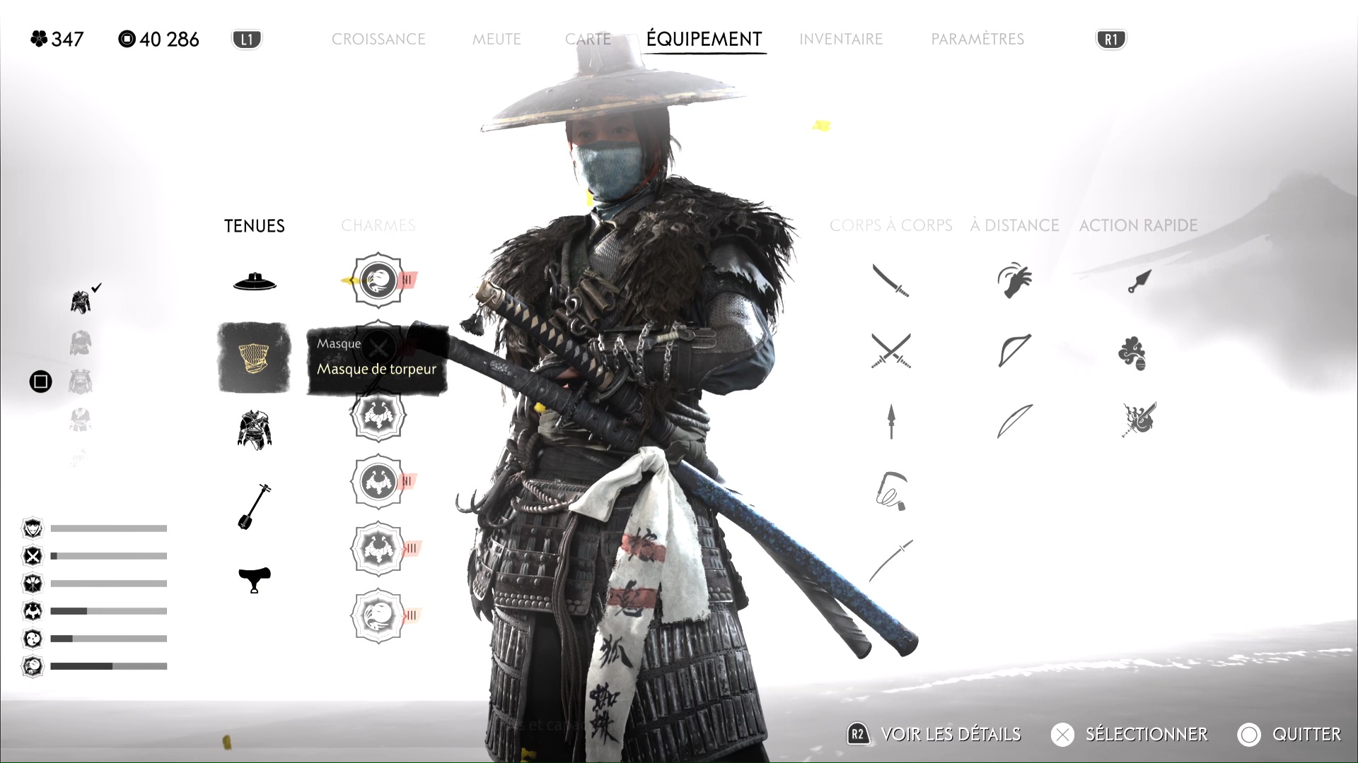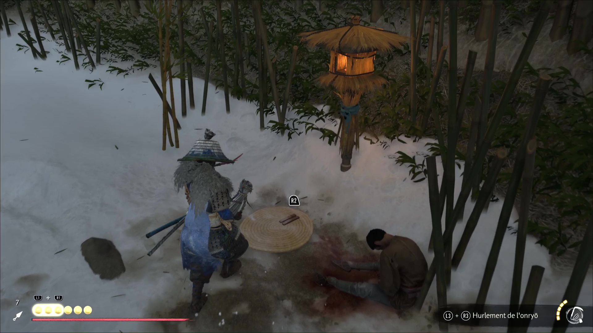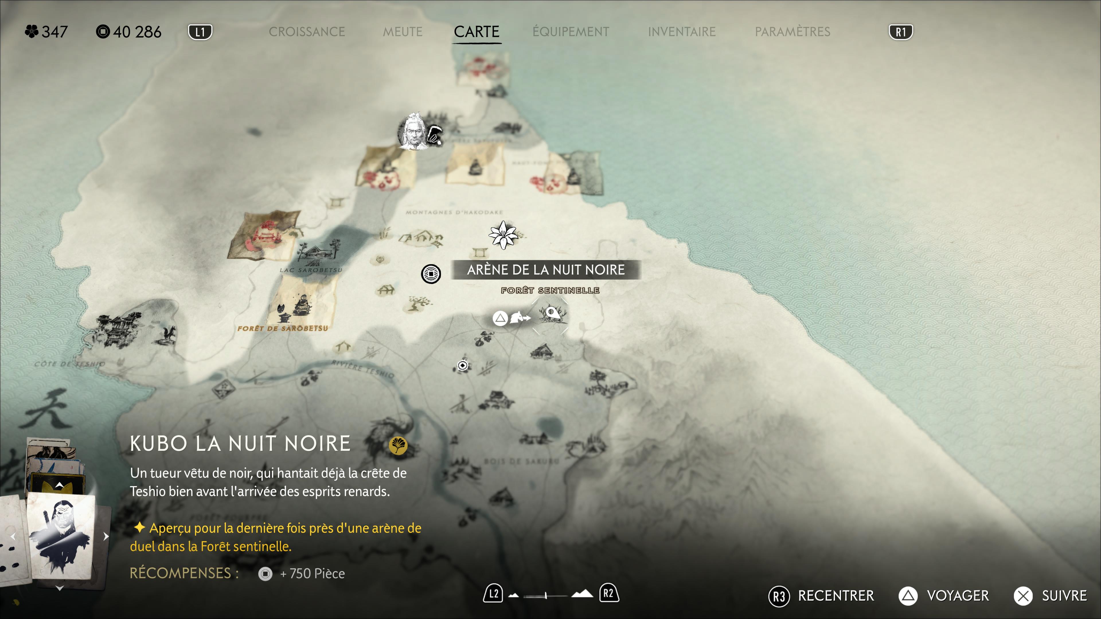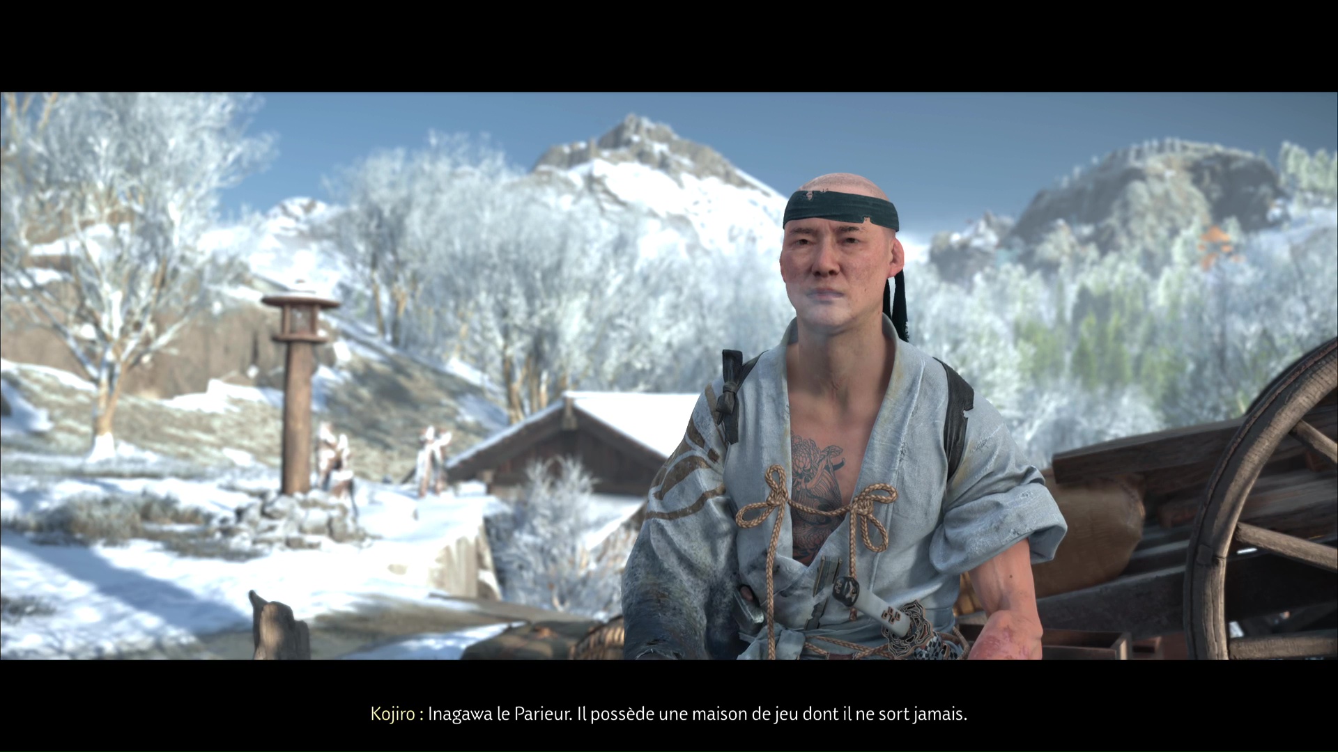Il dispose aussi d’un bouclier et d’une épée qu’il est susceptible de sortir. En ce cas, switchez sur votre kusarigama si vous le possédez. Kubo désormais à terre, récupérez sur son cadavre le Masque de Kubo la Nuit noire, et allez encaisser votre prime de 750 pièces.