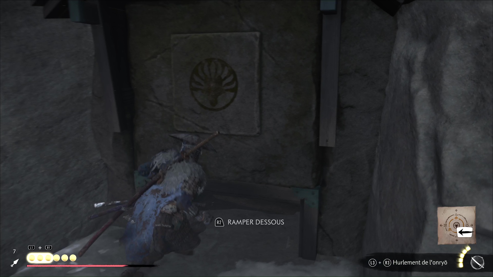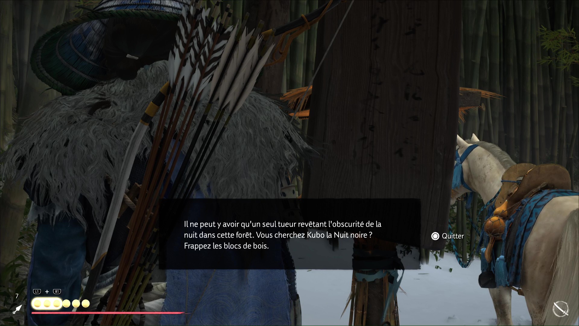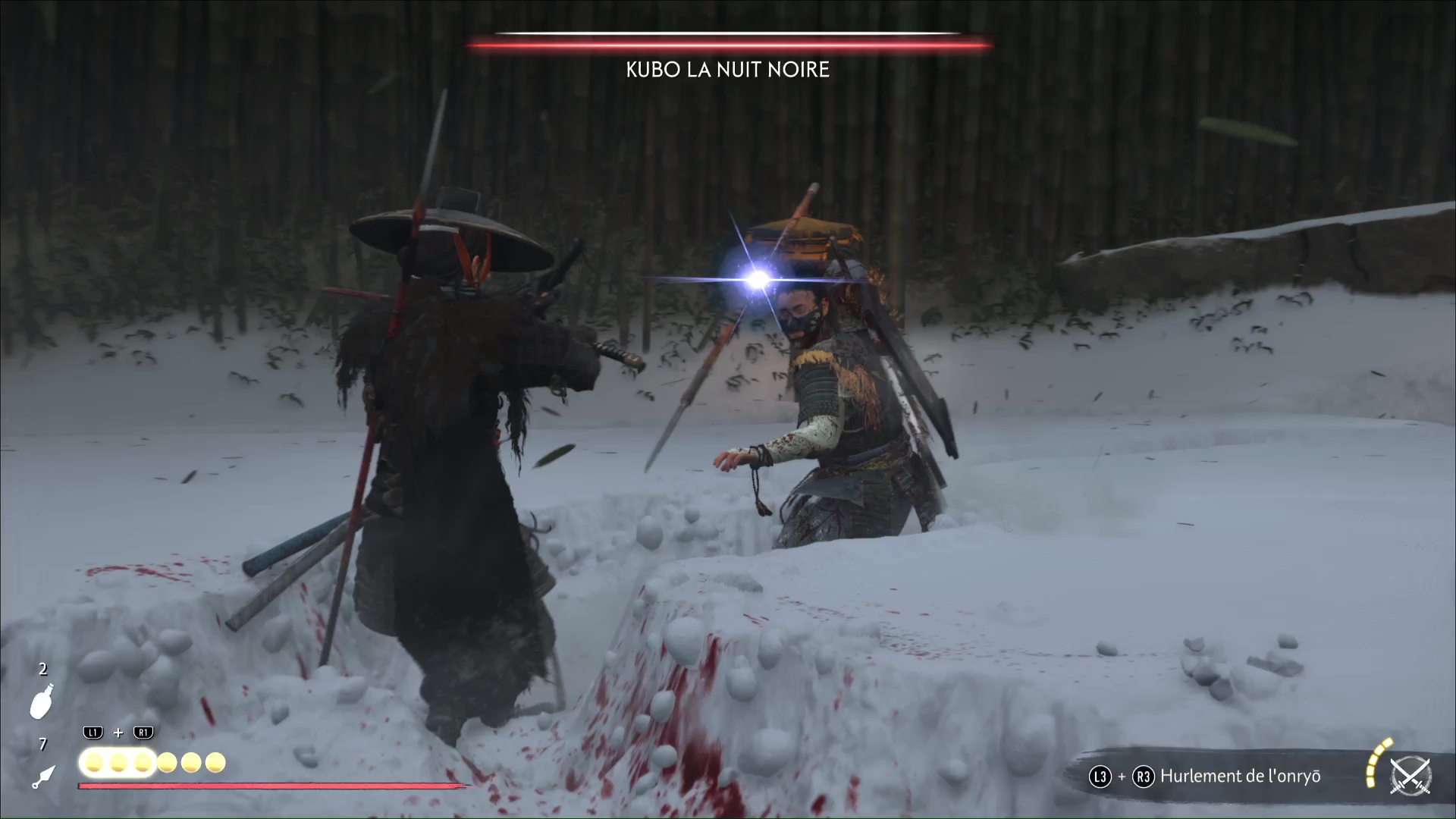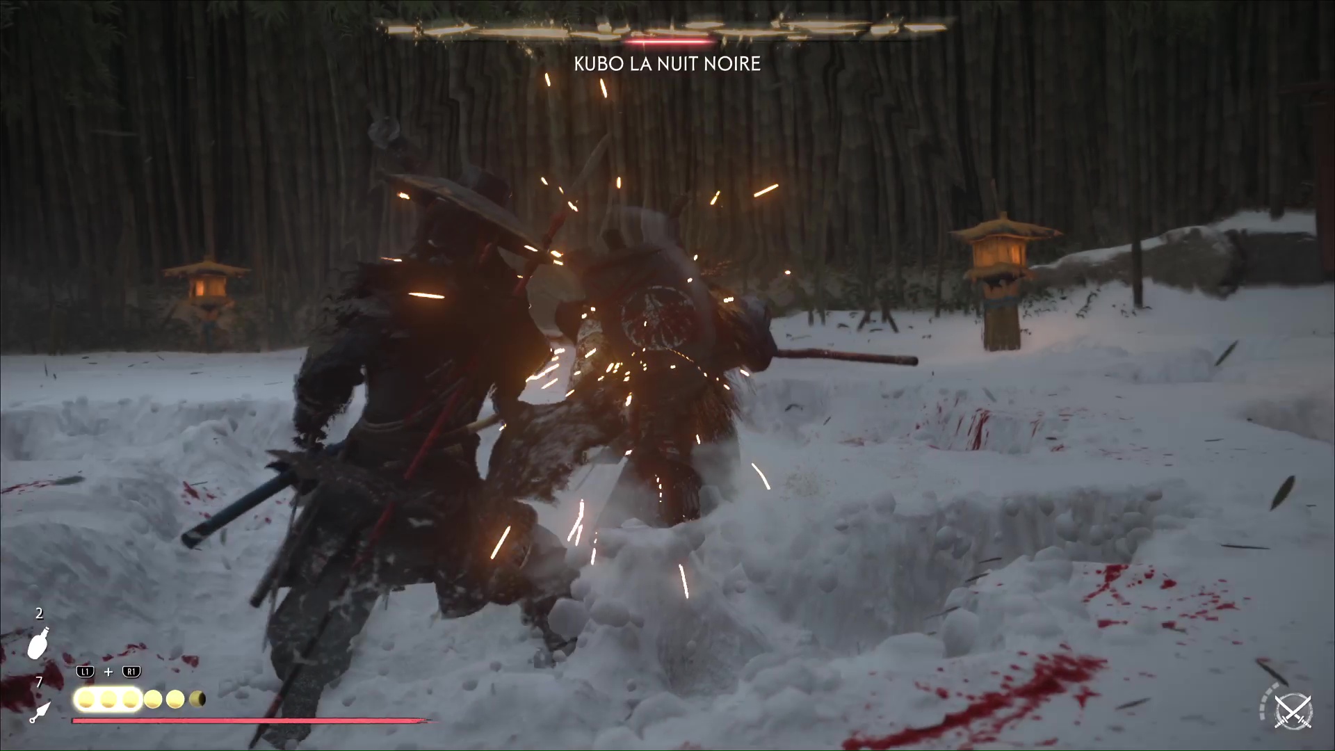 La deuxième information est que, dès que vous êtes prêt, il faut frapper des blocs de bois pour faire venir Kubo. Ces blocs vous attendent dans un coin de l’arène, sur un tapis et devant un cadavre.