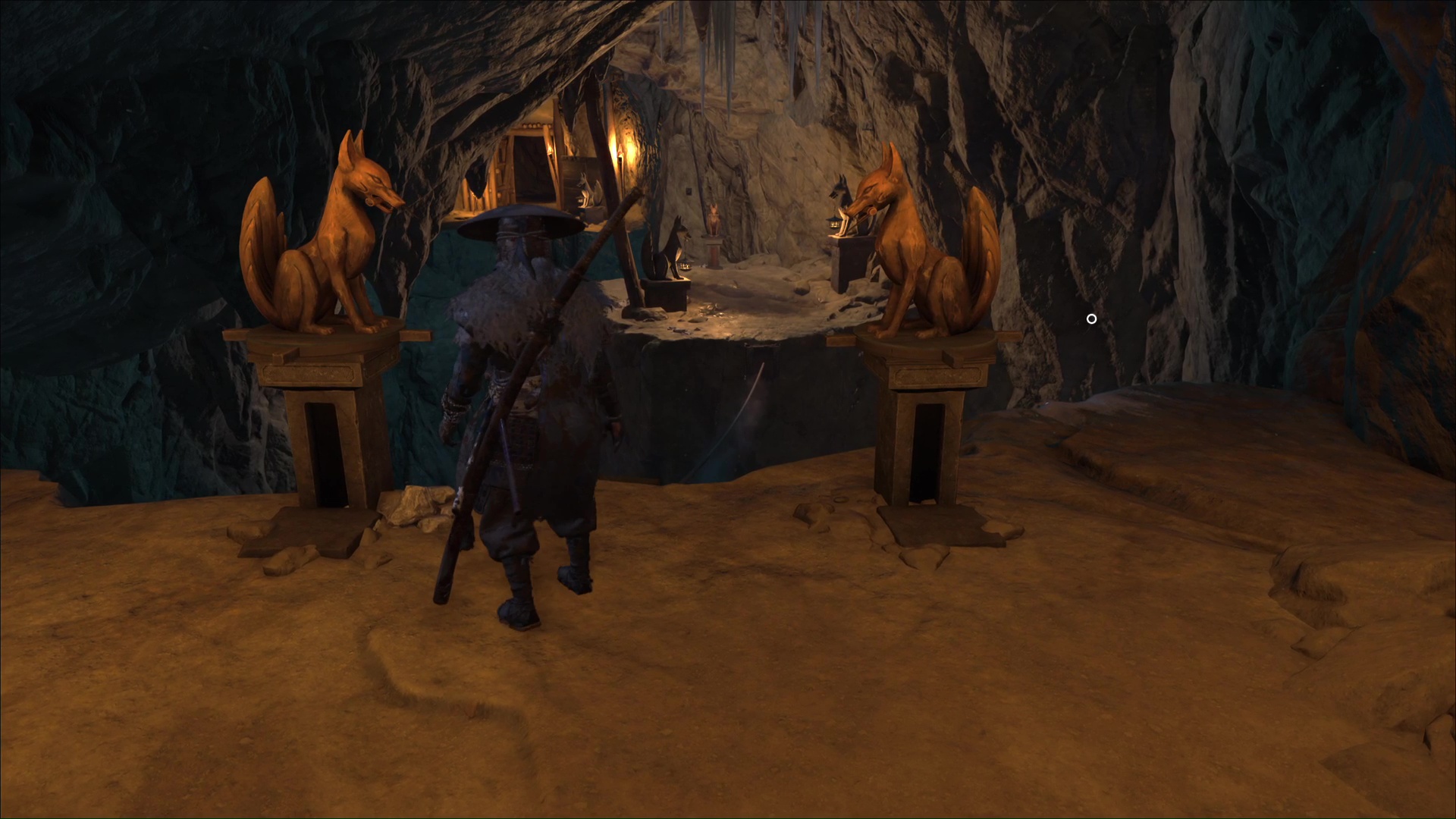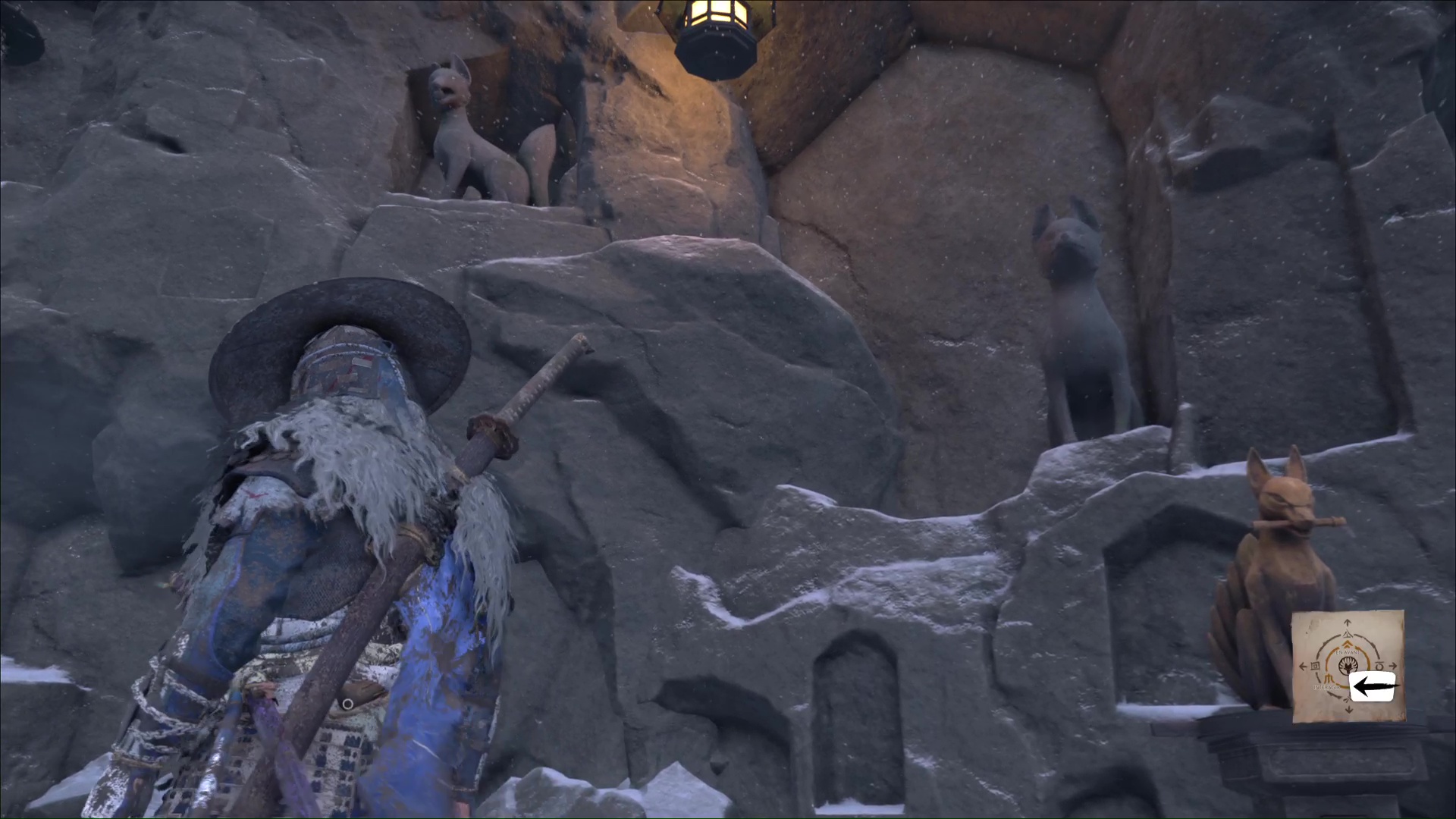 Un peu plus loin, deux autres autels peuvent être pivotés. Celui de droite doit regarder vers vous, et celui de gauche doit regarder à gauche. Vous pouvez désormais ramasser la statuette de renard contre le mur pour la poser sur un socle devant la porte.