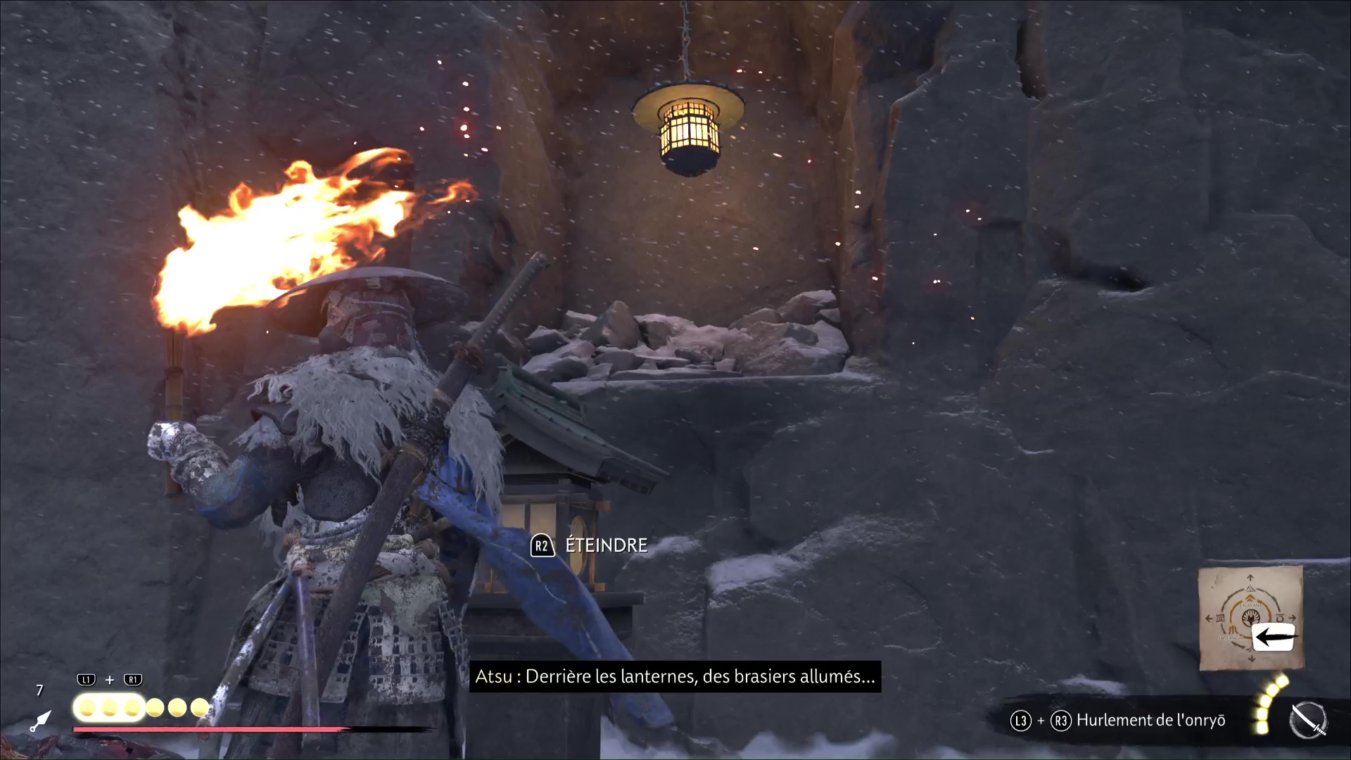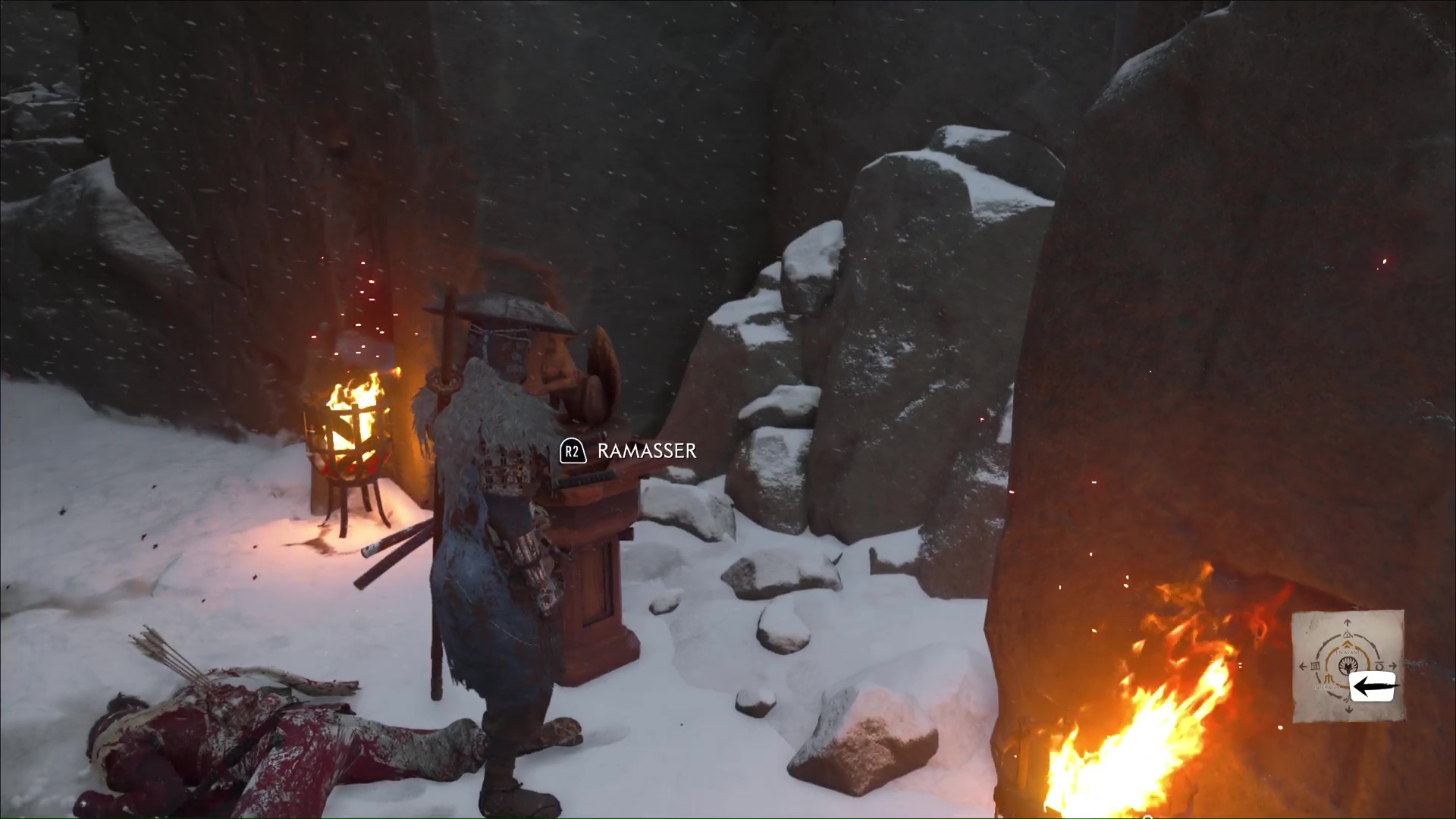 Suivez-le mais vous serez rapidement cueilli par d’autres sbires. Éliminez-les rapidement et occupez-vous aussi de quelques archers avant d’arriver près d’un grand feu. Profitez-en pour vous réchauffer afin de remonter votre vie max.