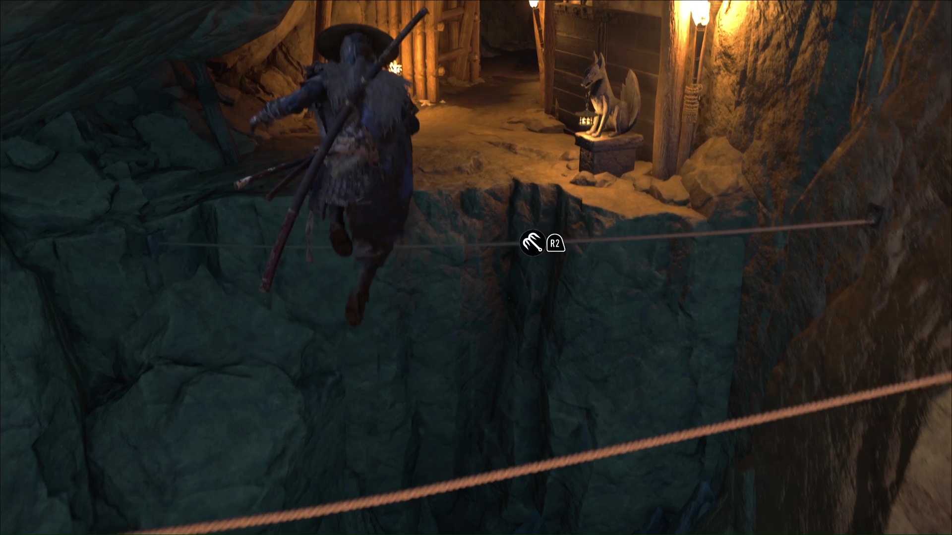 Faufilez-vous pour arriver devant deux autels pivotants. Tournez l’autel de gauche vers la droite, et l’autel de droite vers la gauche. Vous activerez ainsi l’apparition d’une corde qui vous amènera en face. Un dernier autel pivotant vous attend. Tournez-le vers la gauche pour que cette fois trois cordes soient déployées.