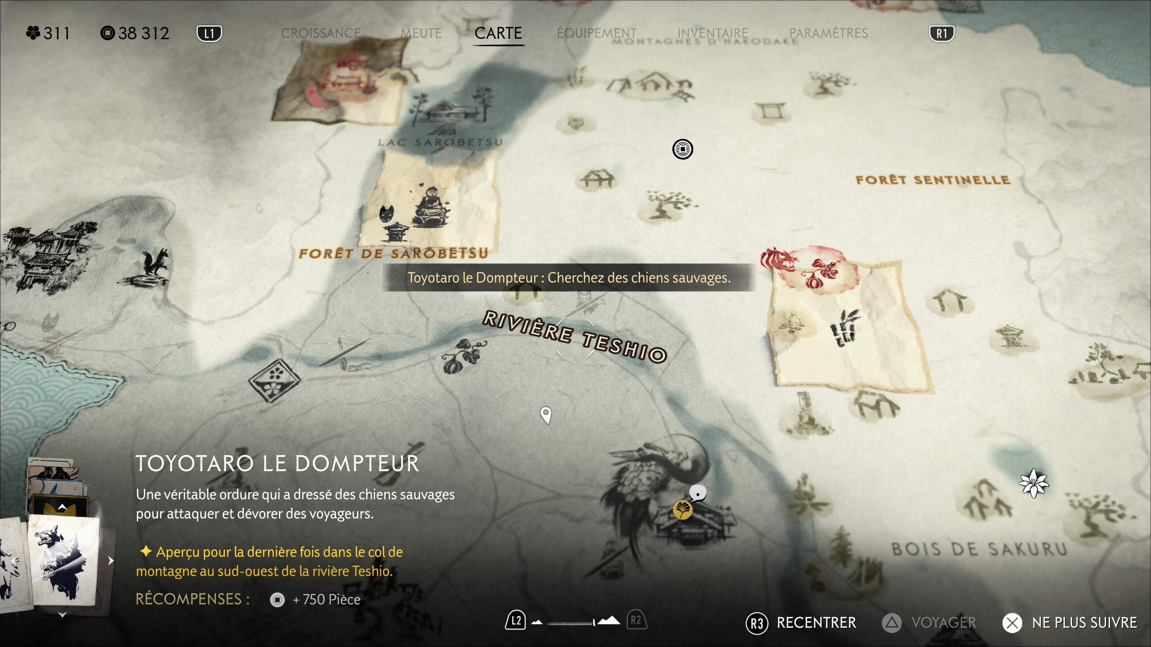Toyotaro le Dompteur est un homme qui dresse des chiens sauvages pour attaquer les voyageurs s’aventurant sur les routes principales de la Crête de Teshio. Vous le trouverez dans son camp au sud de l’inscription Rivière Teshio sur la map, et légèrement au nord-ouest de l’Auberge de la Grue rouge.