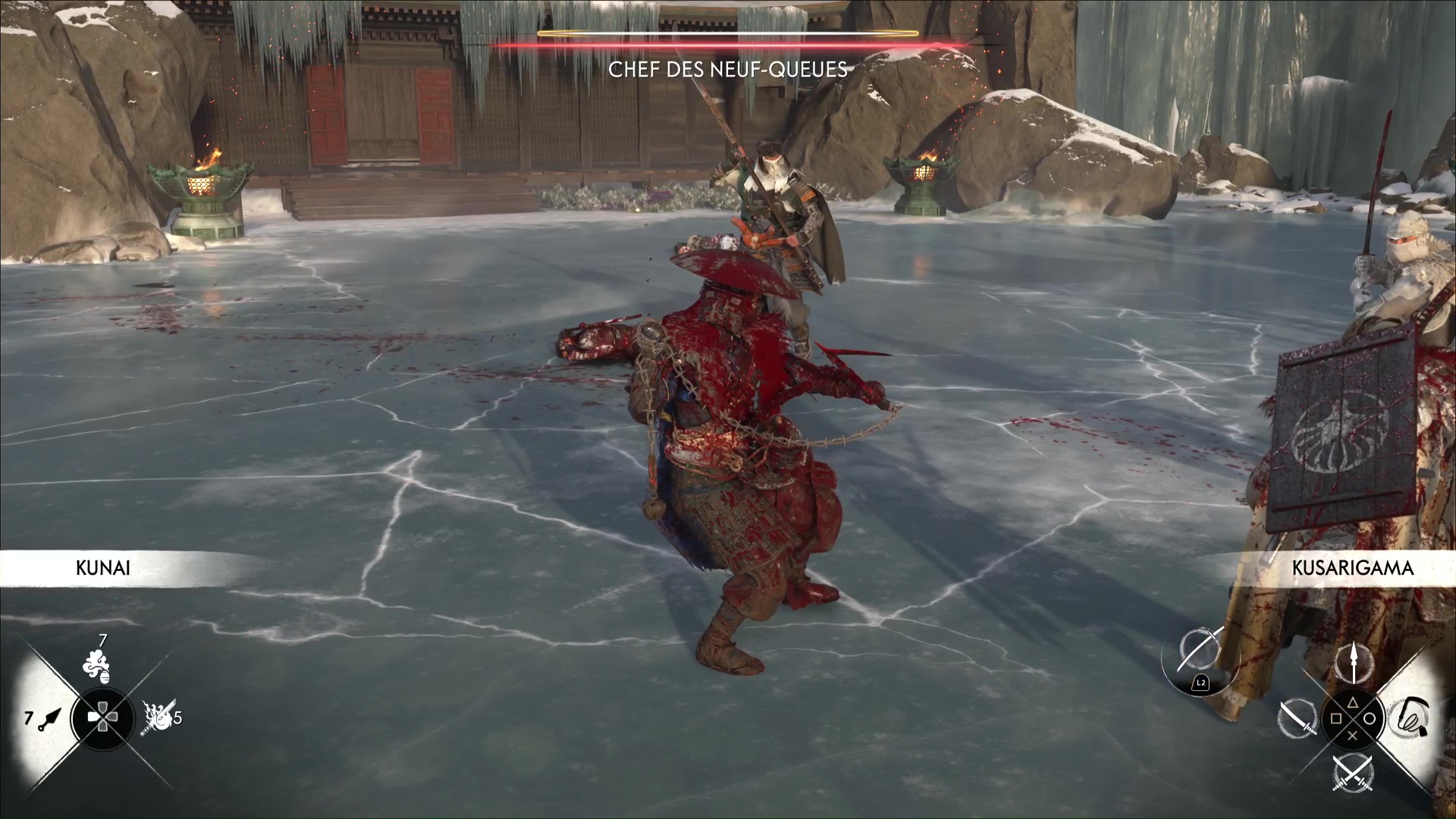 Le combat se lance, et vous aurez à gérer les sbires de votre cible, dont une brute, un soldat équipé de bouclier, des lanciers, bref, un peu de tout. Le chef porte justement un bouclier, et se bat également avec un kusarigama.