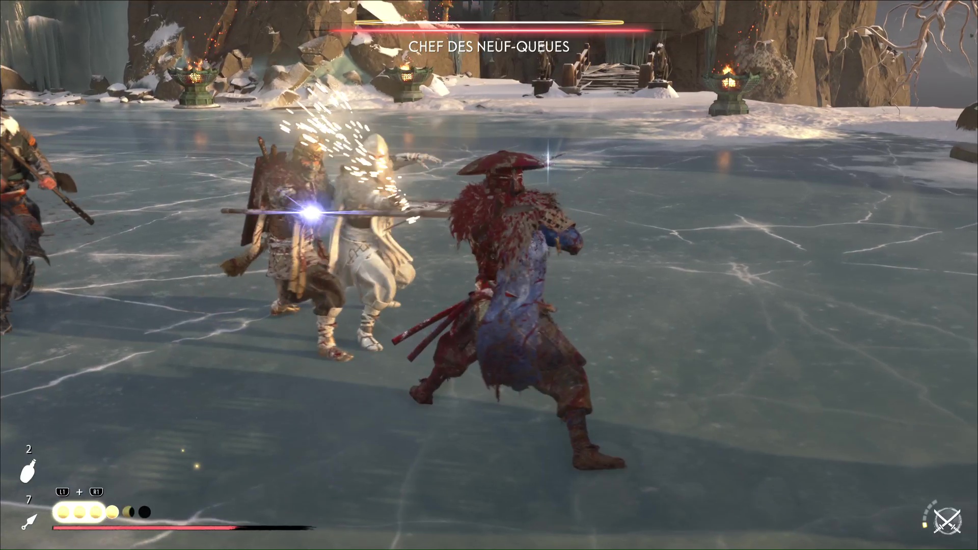 Ce dernier manie également un katana et utilisera un enchaînement attaque rouge puis bleue, ainsi que d’autres combos d’attaques bleues. Notez que votre adversaire utilise aussi une lance.