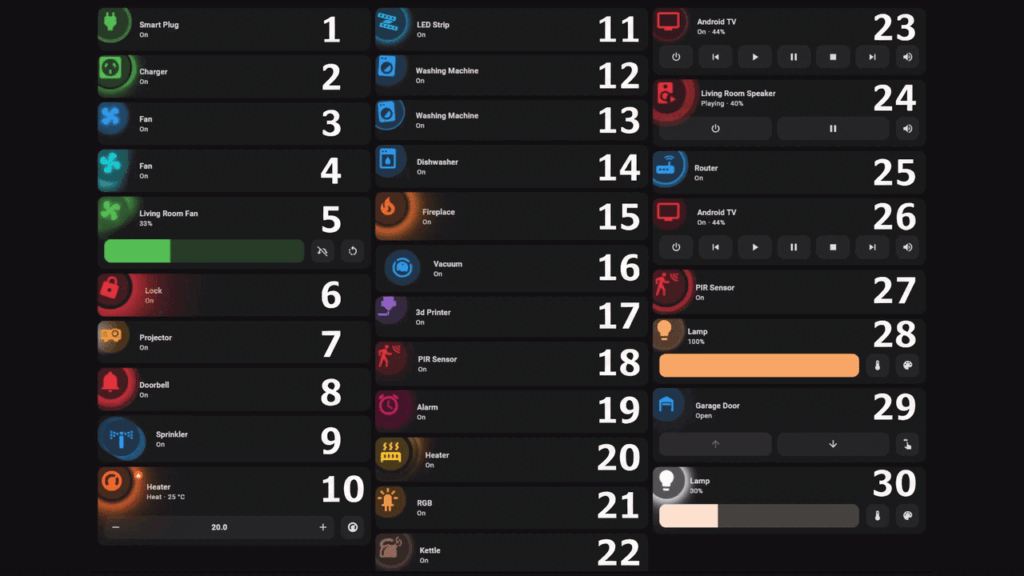 Le projet signé Anashost propose des cartes pour à peu près tout ce qu’on peut connecter : prises connectées, serrures, projecteurs, sonnettes, arroseurs, radiateurs, rubans LED, lave-vaisselle, cheminées, aspirateurs robots, capteurs de température, d’humidité, de CO2, de qualité d’air… Y’a même des cartes pour votre setup gaming, votre PC, votre serveur home, votre Nintendo Switch ou votre horloge Awtrix.