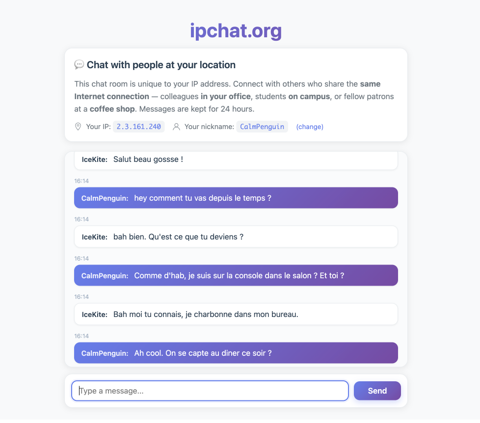 En fait, ce site regroupe automatiquement tous les utilisateurs qui partagent la même adresse IP publique (celle vue par le serveur). En gros, si vous êtes au bureau derrière le même routeur, vous devriez vous retrouver dans le même salon. Pas besoin de créer de compte ni de lien d’invitation, vous débarquez sur le site, vous choisissez un pseudo (ou vous laissez le générateur aléatoire s’en charger) et hop, vous pouvez commencer à causer.