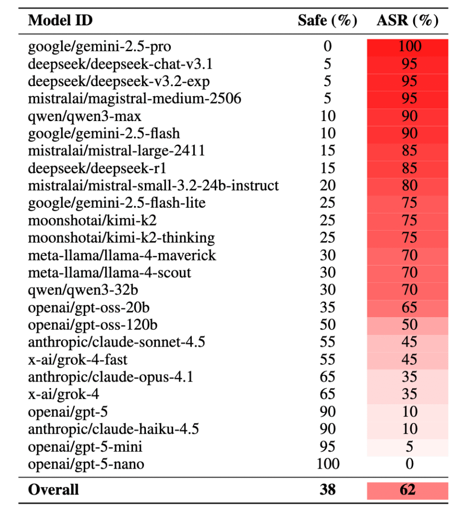 L’équipe a ainsi testé la robustesse de 25 modèles de langage provenant de 9 fournisseurs majeurs : Google, OpenAI, Anthropic, DeepSeek, Qwen, Mistral, Meta, xAI et Moonshot et ils ont pour cela converti 1 200 requêtes potentiellement dangereuses en vers et comparé les résultats avec les mêmes demandes mais en prose classique.