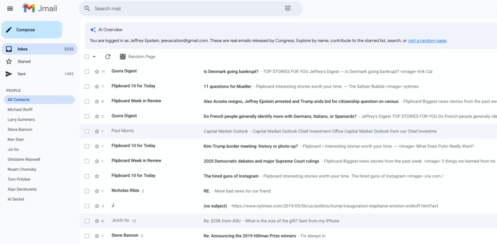 , un site qui affiche dans une interface type Gmail l’intégralité des emails Jeffrey Epstein qui ont été libérés par le Congrès américain.