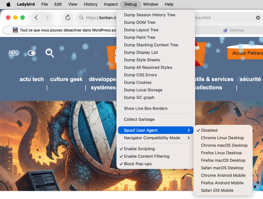 Le concept de Ladybird, c’est zéro code emprunté aux moteurs existants. Tout est écrit en C++ (avec une migration vers Swift prévue), du moteur de rendu LibWeb au moteur JavaScript. C’est donc actuellement le seul navigateur vraiment indépendant en développement actif. Et ça, dans un monde où même Firefox commence à faire un peu polémique sur son indépendance, ça fait du bien.