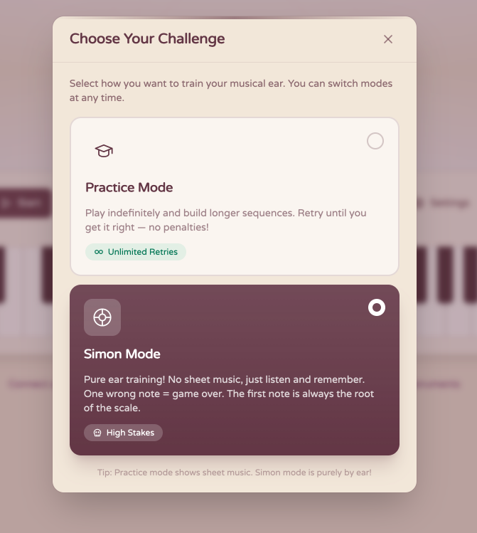 Le principe c’est que le site joue une mélodie, et vous la reproduisez. En mode “Simon” les séquences s’allongent au fil des niveaux et si vous vous plantez, faut recommancer. Et en mode Practice, la difficulté monte progressivement avec un verrou pour bloquer un niveau et s’y acharner en boucle. Ça débute à 4 notes, puis ça augmente…