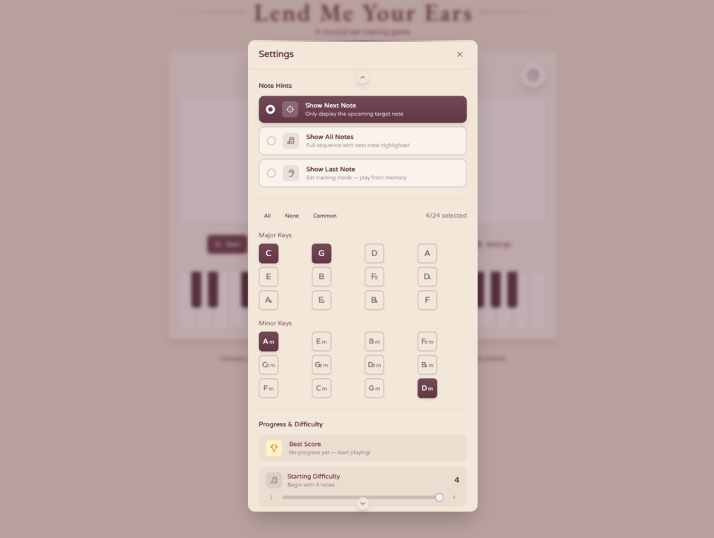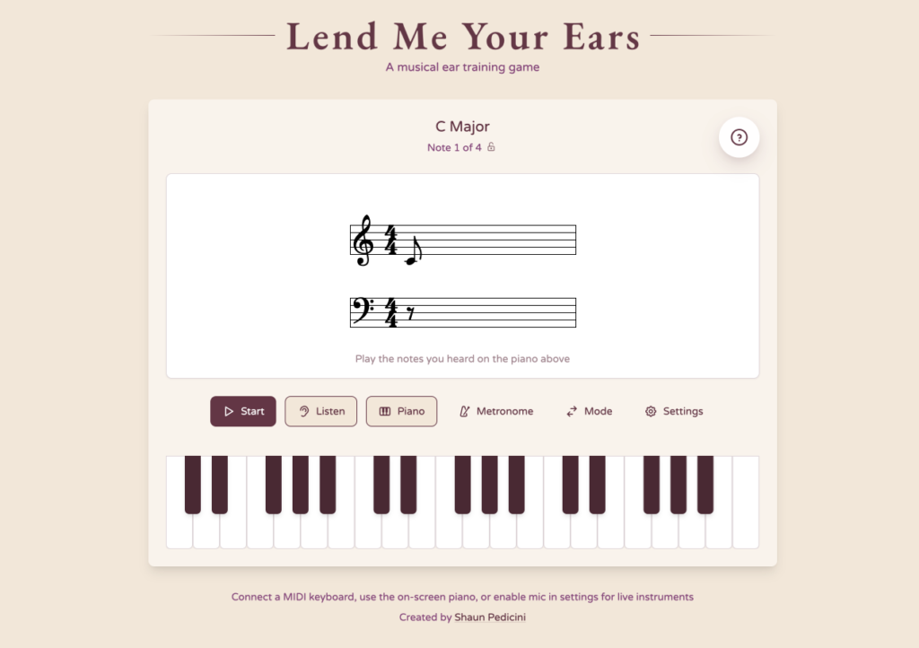 qui est un jeu d’entraînement musical, 100% gratuit, dans le navigateur qui va vous permettre de vous entrainer à l’oreille sans prise de tête. Ce site c’est le boulot d’un seul dev, Shaun Pedicini et y’a pas besoin de compte ni d’abonnement.