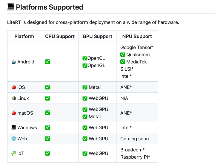 Côté plateformes, c’est plutôt copieux. Sur Android, ça exploite les NPU de Qualcomm, MediaTek et Google Tensor. Sur iOS, Metal se charge du GPU (et l’Apple Neural Engine arrive bientôt). Linux passe par WebGPU, macOS par Metal, et Windows reste en CPU pour le moment, et Google annonce même un support IoT avec Raspberry Pi. Carrément, du smartphone au micro-contrôleur ! Attention par contre, certains supports NPU sont encore marqués “à venir”, donc ne vous attendez pas à tout faire tourner sur n’importe quel chipset dès demain.