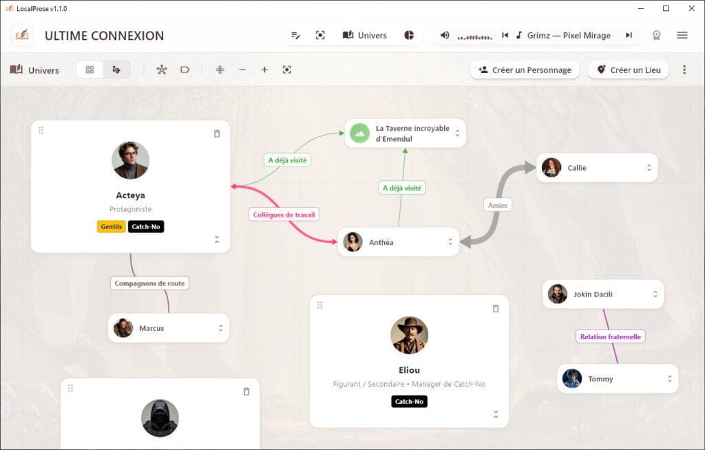 Dans l’outil vous retrouverez pèle mêle un éditeur sans distraction avec timer Pomodoro, de la dictée vocale ou plutôt un mode de capture d’idées mains-libres, un système de gestion d’univers pour organiser vos personnages et décors avec des fiches relationnelles et une fonction d’audit de cohérence narrative.