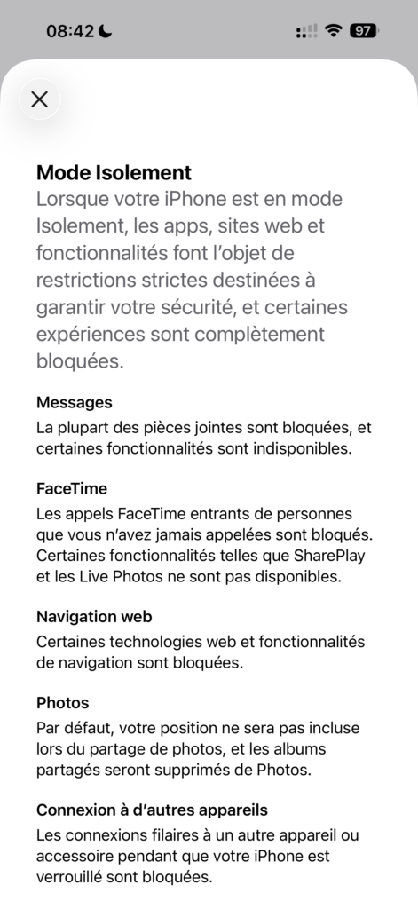 Parce que pour ceux qui débarquent, ce mode isolement c’est un bouclier qu’Apple a conçu à la base pour protéger les utilisateurs ciblés par des spywares type