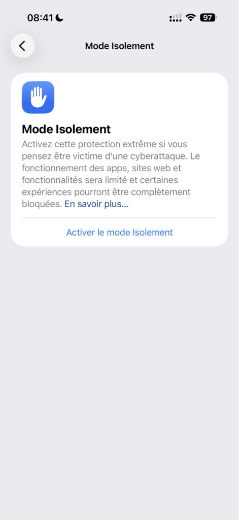 . Pour activer le mode isolement, c’est dans Réglages > Confidentialité et sécurité > Mode Isolement > Activer.