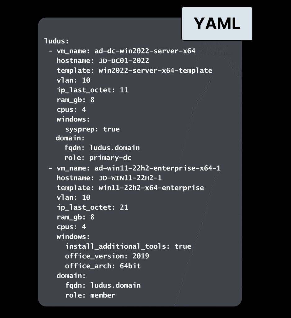 Le truc cool, c’est que Ludus utilise Packer et Ansible en arrière-plan. Les templates sont construits à partir d’ISOs vérifiées, et tout est déployé de manière reproductible. Comme ça si vous voulez 255 VLANs, pas de souci. Si vous avez besoin de règles firewall custom ou de définir rôles Ansible pour configurer vos machines, c’est fastoche. Bref, Ludus vous laisse faire du high-level en YAML tout en gérant la complexité technique pour vous.