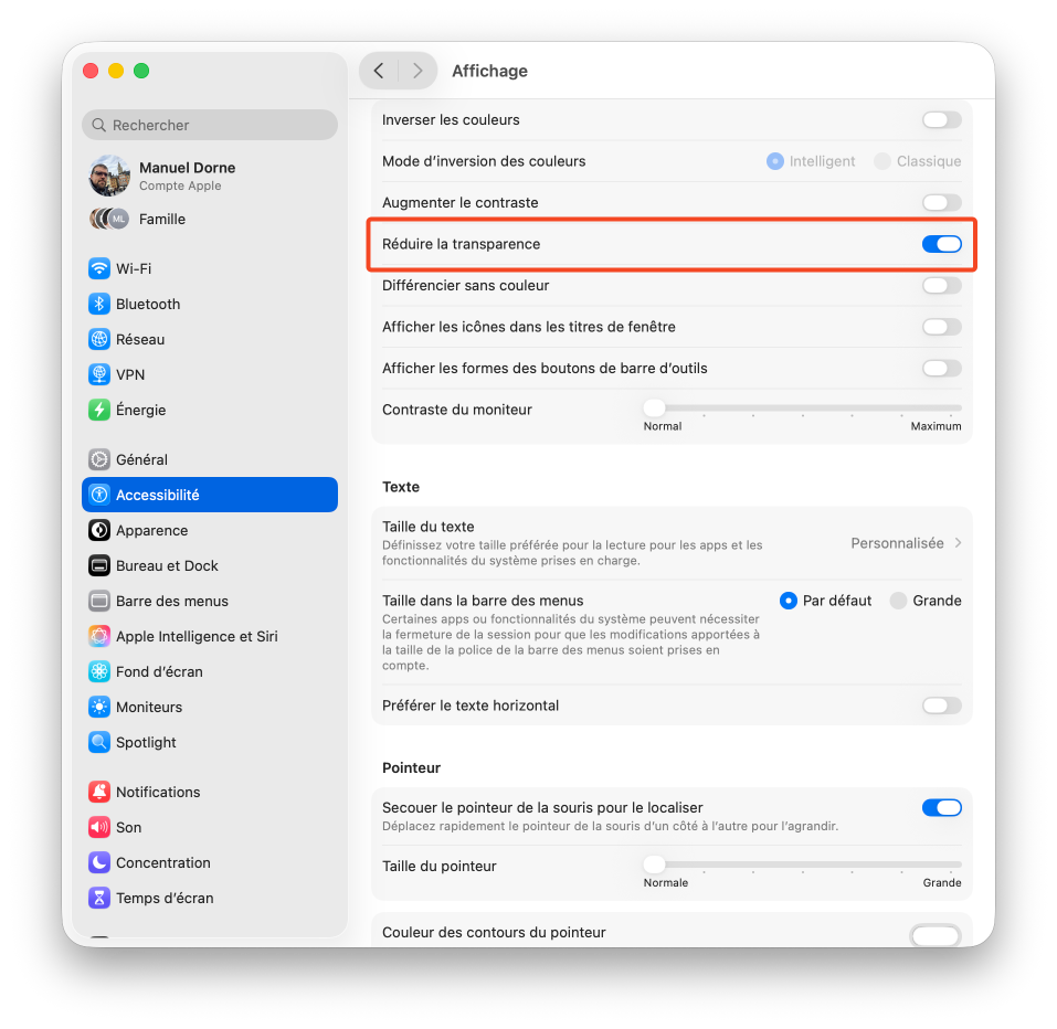 Heureusement, y’a des solutions pour virer toute cette merde. La première c’est la méthode officielle via les réglages d’accessibilité. Vous ouvrez Réglages Système, vous allez dans Accessibilité puis Affichage, et vous cochez “Réduire la transparence”. Ça désactive pas complètement Liquid Glass mais ça réduit l’intensité de l’effet. C’est mieux que rien.