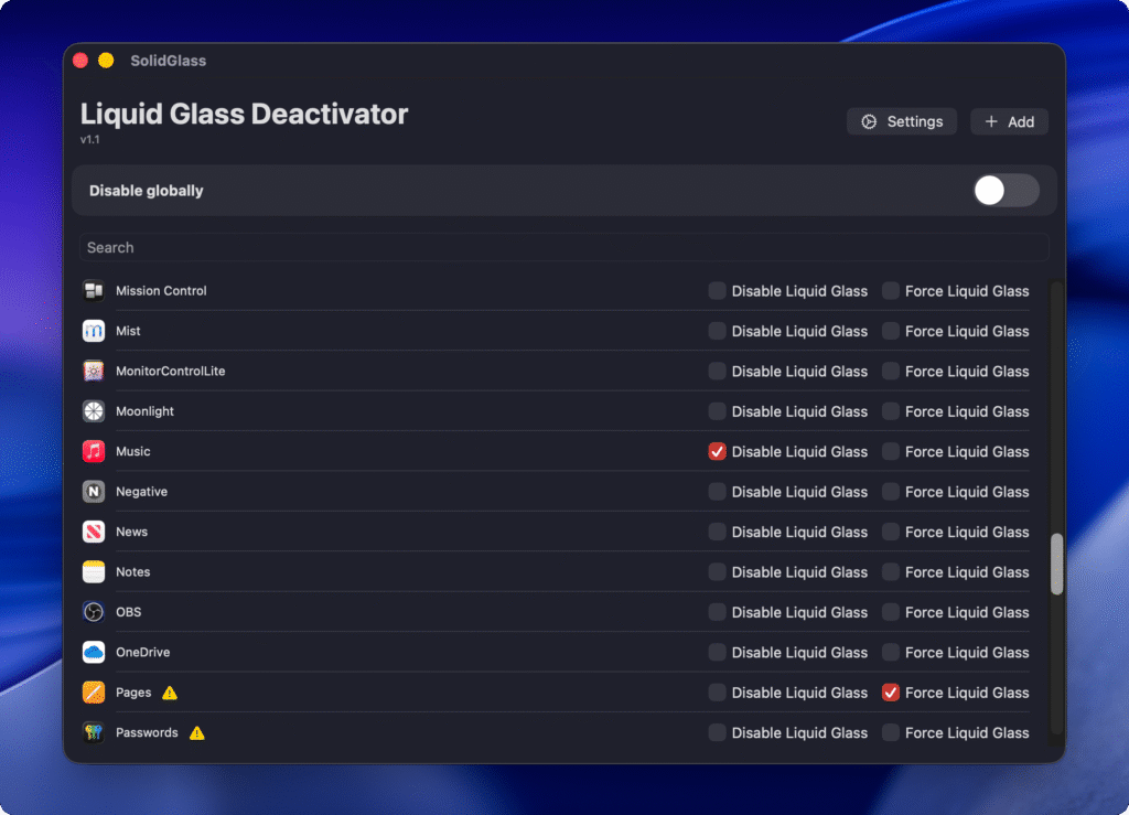 , un petit utilitaire gratuit et open-source qui vous permet de désactiver Liquid Glass soit pour tout le système, soit app par app. Vous le téléchargez, vous lui donnez les permissions d’accessibilité (oui, ça demande pas mal d’accès mais c’est open-source donc vous pouvez vérifier le code), et il vous liste toutes vos apps installées avec des cases à cocher.