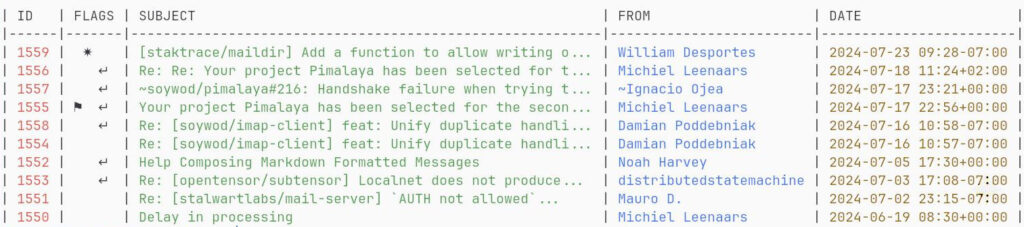 Vous pourrez ensuite lister vos messages, les lire, ajouter des pièces jointes et même composer vos réponses dans votre éditeur de texte préféré (Vim, Emacs, ou même Nano si vous n’avez pas encore vu la lumière). Et si vous voulez automatiser des trucs, sachez qu’il peut cracher du JSON, ce qui est parfait pour faire de la bidouille terminal avec d’autres scripts.