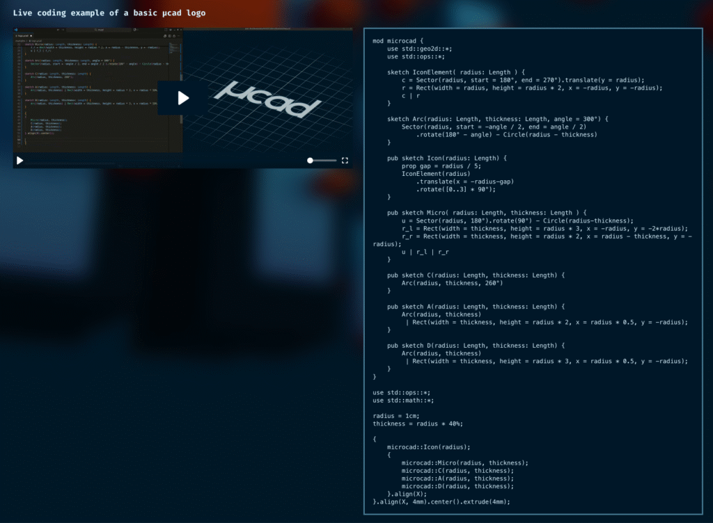 C’est pourquoi une équipe de développeurs allemands a décidé de tout reprendre de zéro. Le projet s’appelle µcad (prononcez ça microcad), et c’est la même philosophie qu’OpenSCAD, mais avec une syntaxe moderne inspirée de Rust, avec évidemment de meilleures performances, et une architecture plus solide. Vous pouvez donc toujours composer des formes basiques pour créer des géométries complexes, faire des opérations booléennes, et exporter vos modèles en .STL pour l’impression 3D ou en SVG pour la découpe laser.