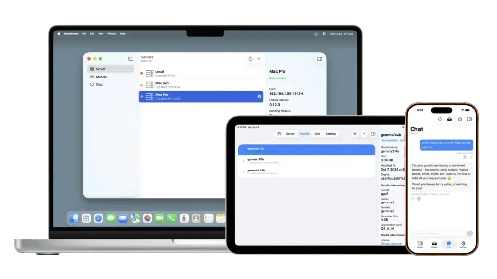 vient combler ce fossé. C’est une app de gestion Ollama pour macOS, iOS, iPadOS, et même visionOS si vous avez ce truc. C’est donc une vraie app native avec interface graphique, développée en Swift et SwiftUI dans laquelle ous ajoutez vos serveurs Ollama, et où vous gérez vos modèles, et vous testez vos LLM via un chat basique.