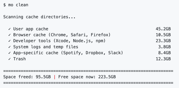 Par exemple, pour le nettoyage en profondeur, c’est mo clean. L’outil va scanner vos caches système, les logs, les données des navigateurs, et tout le bordel qui s’accumule avec le temps. Dans les exemples donnés par le développeur, il parle de récupérer jusqu’à 95 Go d’espace disque. Évidemment ça dépend de votre usage, mais ça donne une idée du potentiel.