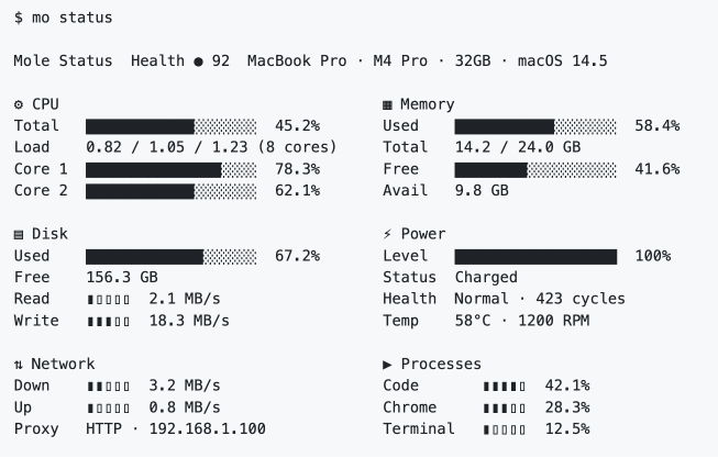 Côté monitoring système, mo status vous affiche un dashboard temps réel avec CPU, RAM, réseau, et métriques de santé. Un peu comme iStat Menus mais directement dans votre terminal. Et avec mo analyze, vous avez un explorateur visuel de l’espace disque avec des barres de progression ASCII. Très DaisyDisk vibes. Et mo analyze c’est pareil mais pour l’espace disque…
