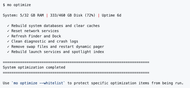 La commande mo optimize va rafraîchir les caches système et relancer certains services pour remettre de l’ordre. Et pour les devs, mo purge est une tuerie : ça nettoie les dossiers de build de vos projets (node_modules, target, build…) qui peuvent facilement bouffer des dizaines de gigas si vous bossez sur plusieurs projets.