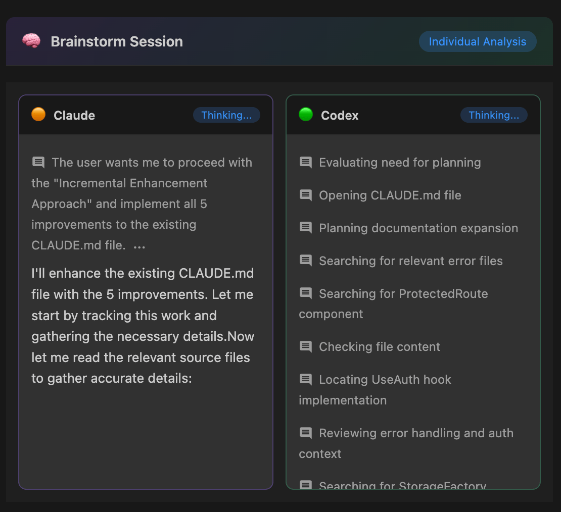 L’extension intègre ce qu’ils appellent le “Brainstorm Mode” où concrètement, vous sélectionnez deux modèles (par exemple Claude via claude-code et OpenAI via openai-codex) et vous les lancez sur votre problème.